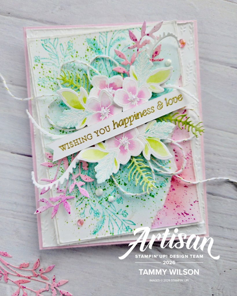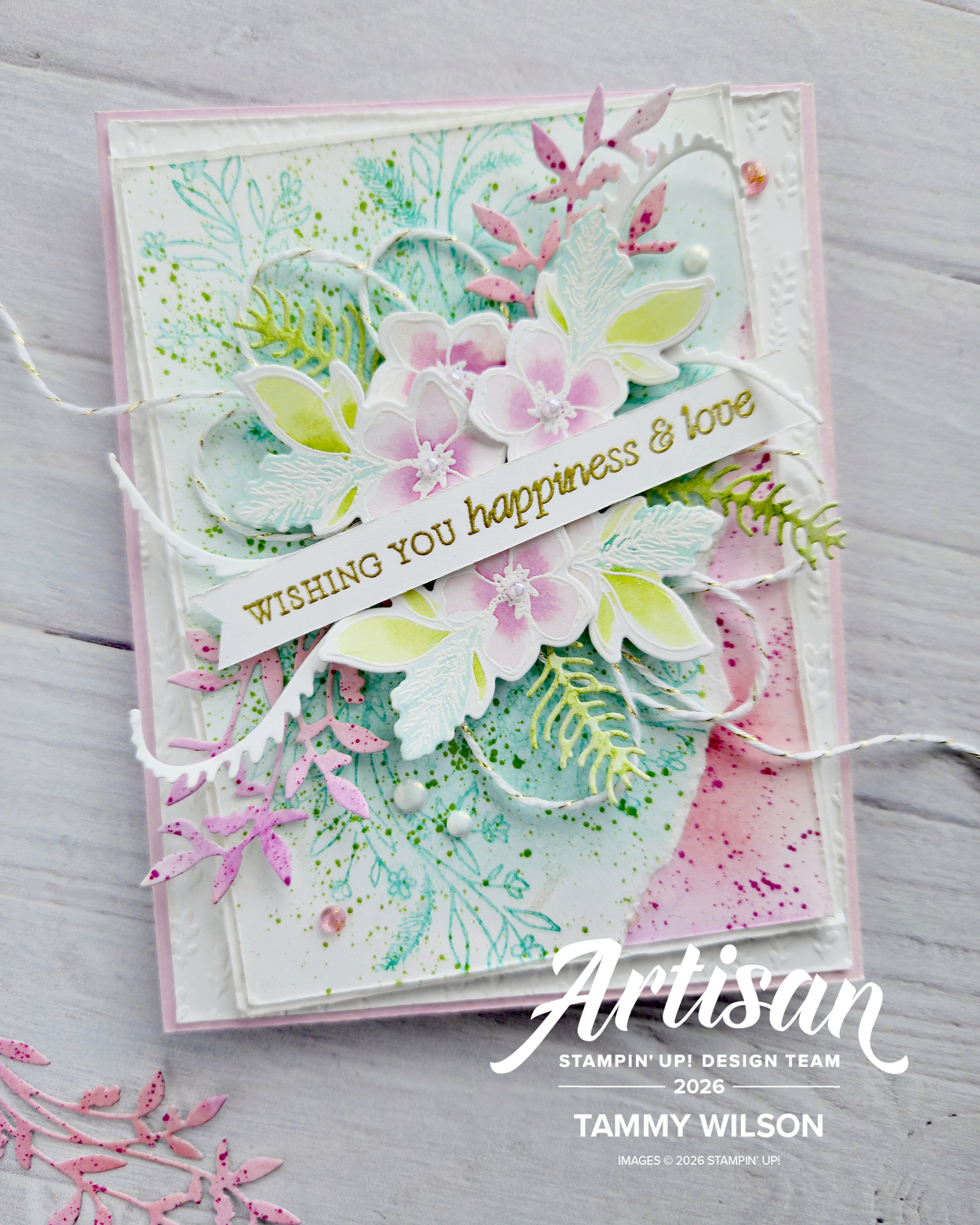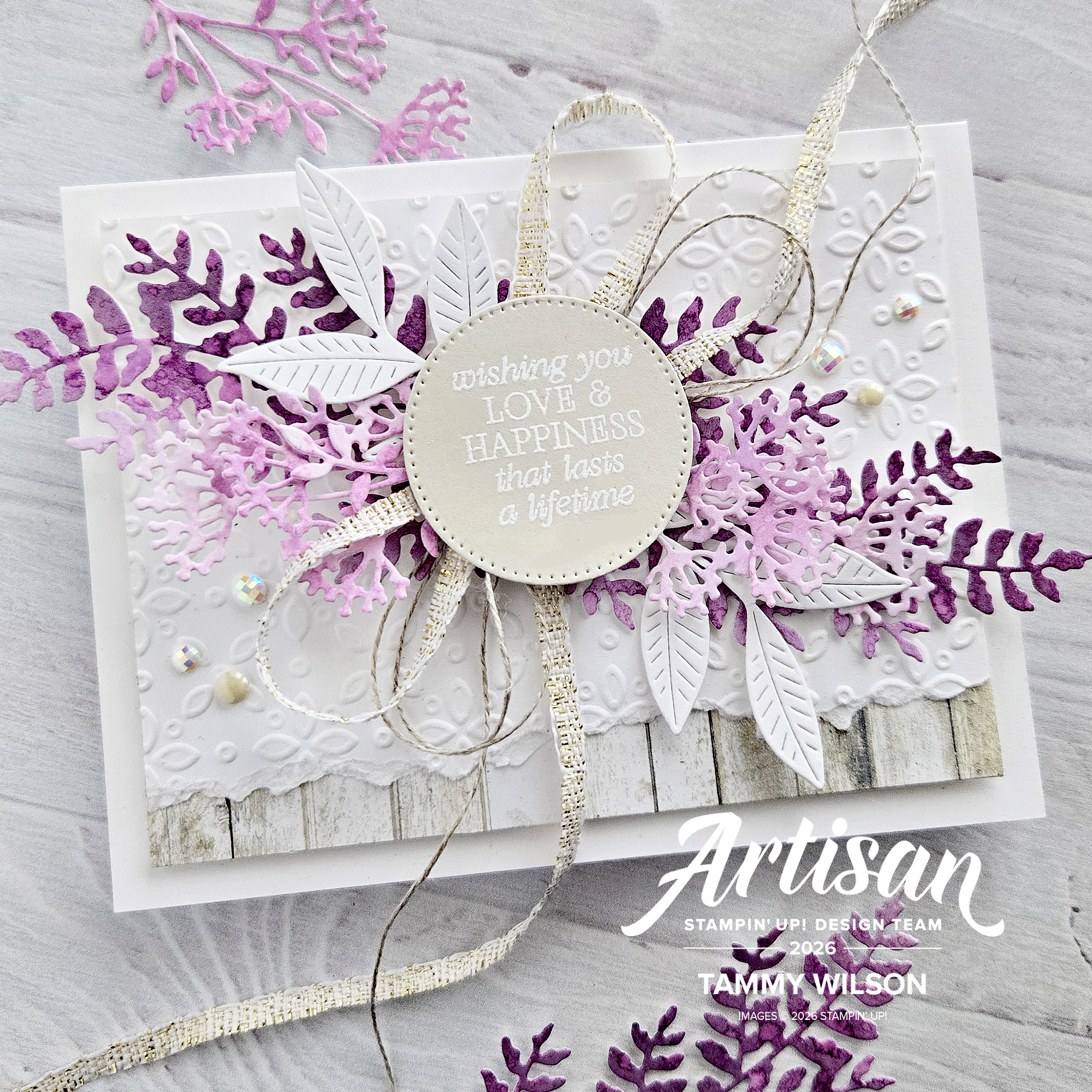 For my card, I chose to use the Impressions Abloom Dies (for all the for the flowers branches)…..along with the Beautiful Gallery Designer Series Paper and the Country Woods Designer Series Paper. For the heat-embossed sentiment, I used the Notes & Totes Stamp Set.