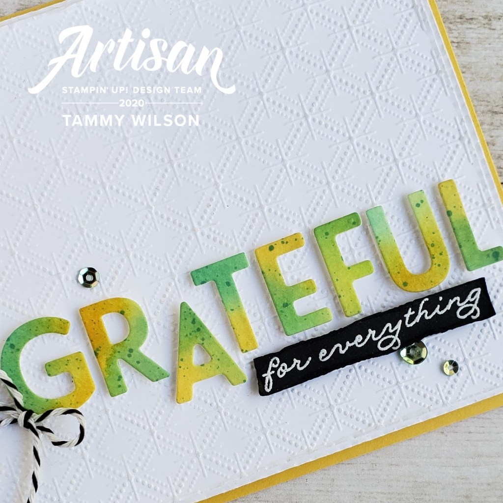 I used the Playful Alphabet Dies to cut out my letter from my watercolored paper, and adhered them with several Mini Stampin’ Dimensionals. (I cut the Dimensionals in smaller pieces so that they would fit on the back of the letters.)