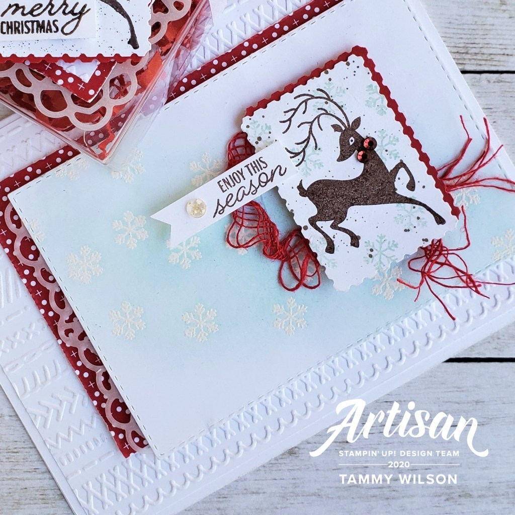 I stamped the reindeer (from the Festive Post Stamp Set) in Early Espresso on Whisper White Cardstock, and punched it out with the coordinating Rectangle Postage Stamp Punch. I also stamped a few snowflakes (from the Festive Post Stamp Set) in Pool Party (“stamped off” once). To create the speckling, I “flicked” the thick end of my Early Espresso Stampin’ Write Marker against the edge of the marker cap, and “flicked” outward towards my paper. Underneath, I layered some Real Red Cardstock, also punched out with the Rectangle Postage Stamp Punch. Before I popped it up with a few Stampin’ Dimensionals, I added a bit of distressed Real Red Braided Linen Trim.