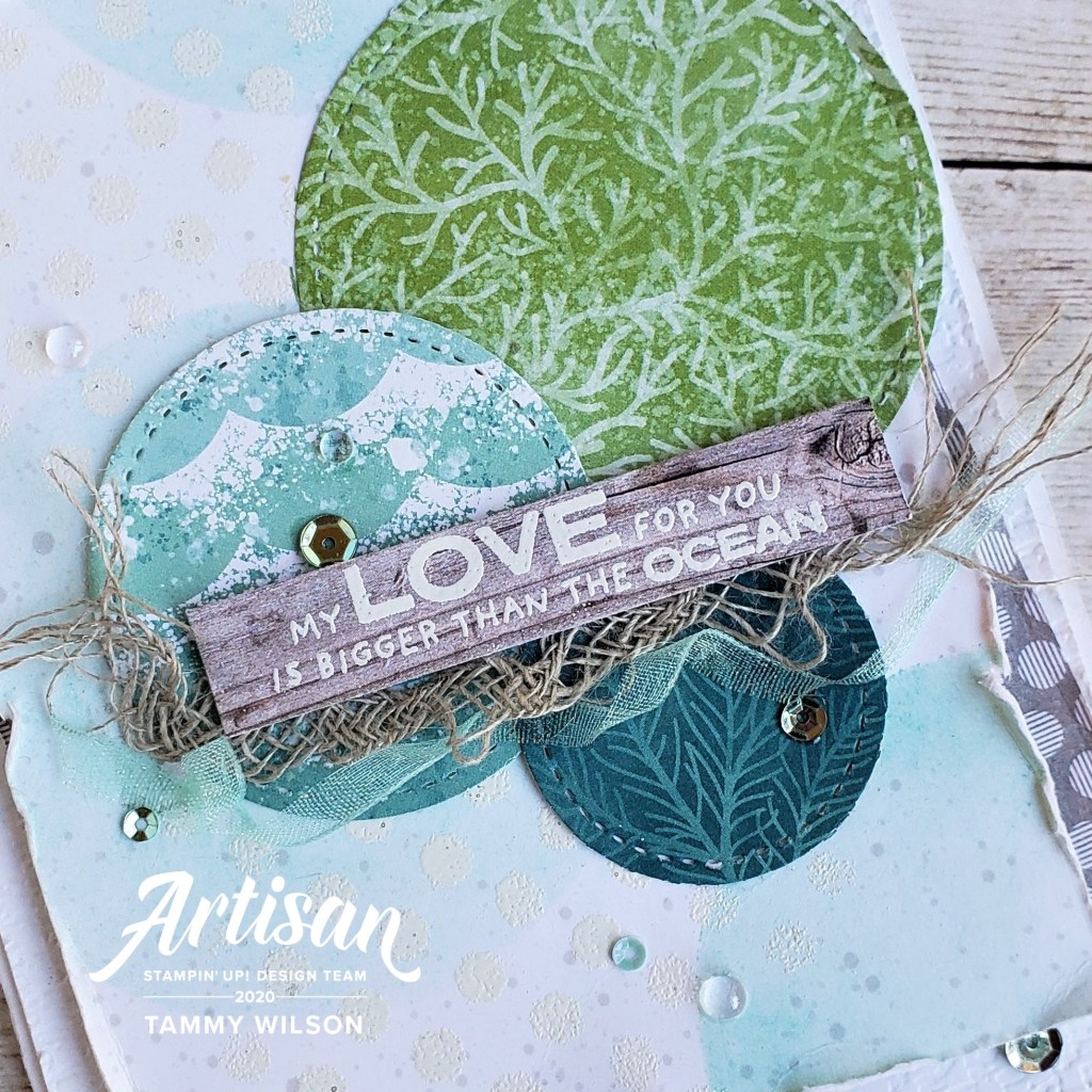 To add some large pops of color, I cut out three different sized circles from the Whale of a Time Designer Series Paper, using the Stitched Shapes Dies. The sentiment (from the Whale Done Stamp Set) was heat-embossed on a small piece of In Good Taste Designer Series Paper, using my Versamark Pad and White Stampin’ Emboss Powder. Before I popped up the sentiment with a few Mini Stampin’ Dimensionals, I added some distressed Braided Linen Trim and Pool Party Sheer Ribbon (cut in half vertically). For a bit of bling, I sprinkled on several of the Whale of a Time Sequins, and a few Flowers for Every Season Gems.