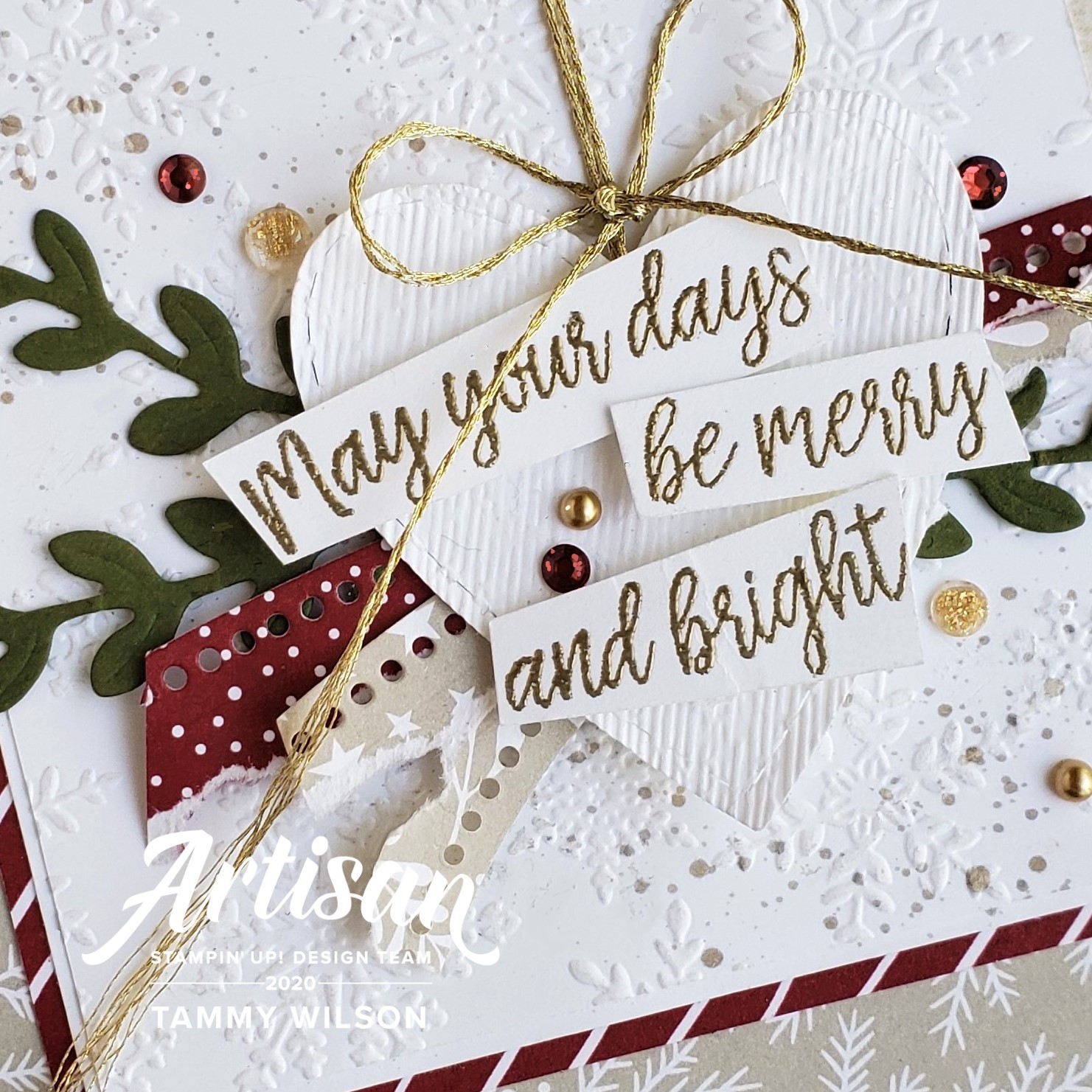 Beautiful! Love the way you’ve created the hanging ornament effect and cut up the sentiment. The eyelet holes cut into small strips make for an interesting ribbon. Love this, Tammy!