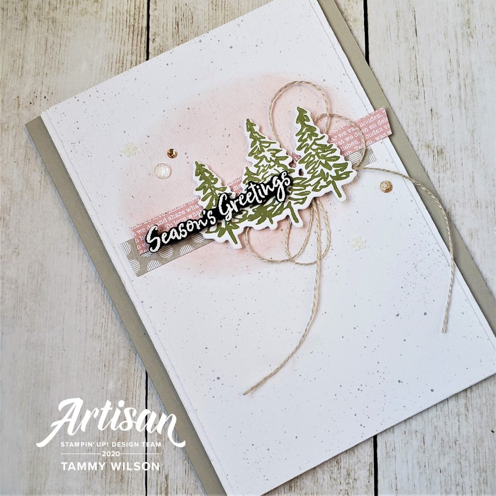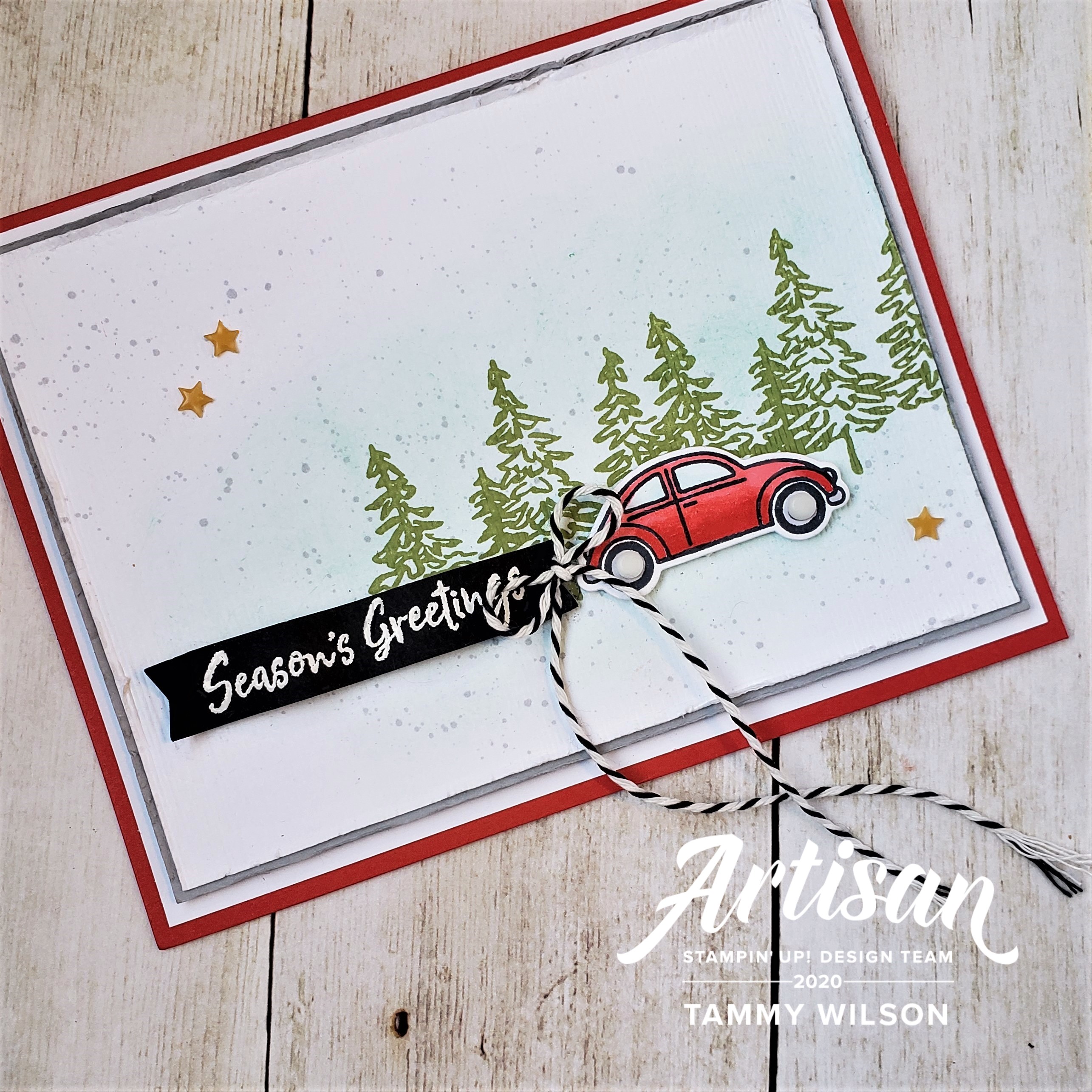 12.20.20…..Happy Sunday, everyone! I know Christmas is just a few days away, but I thought I would try to squeeze in one more Christmas card! That being said, I love to combine multiple stamp sets in one project. So….for this card I used the In the Pines Bundle, along with little car (from the Coming Home Bundle). I just love that little red bug!