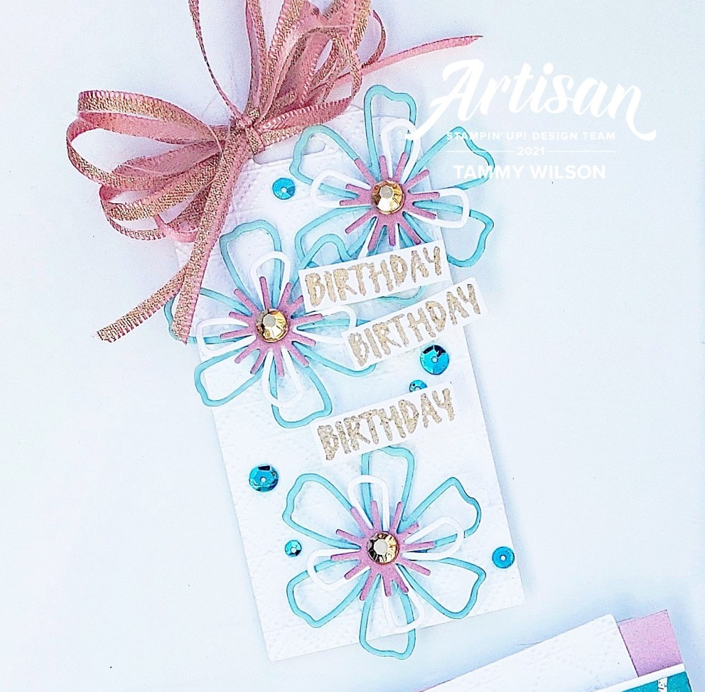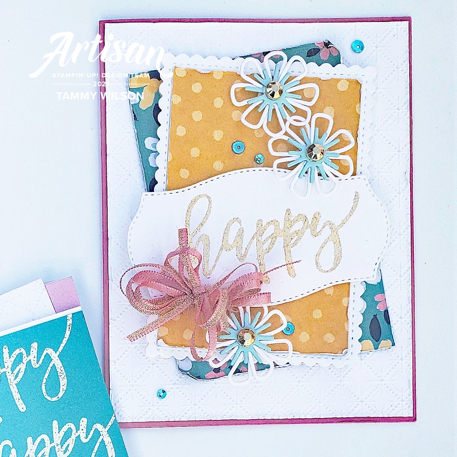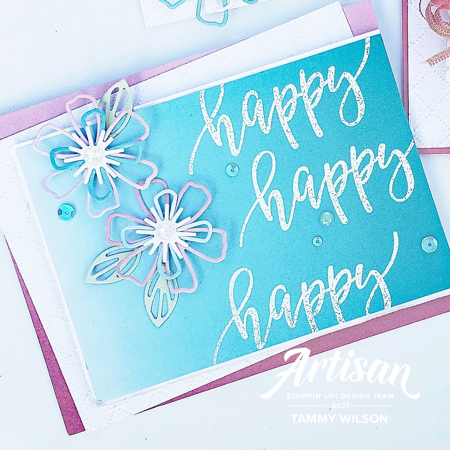 I used the dies from the Pretty Perennials Bundle, to cut out the leaves and the flower pieces from Coastal Cabana Cardstock and white cardstock.) The “happy” sentiment (also from the Pretty Perennials Bundle) was created with Gold Leafing, along with Heat & Stick Powder. After I cut out the sentiment with one of the Tasteful Labels Dies, I popped it up with a few Stampin’ Dimensionals. For some fun texture, I created a bow with the Blushing Bride Metallic Ribbon (cut in half vertically). For a bit of bling, I sprinkled on a several Woven Threads Sequins and a few Gilded Gems.