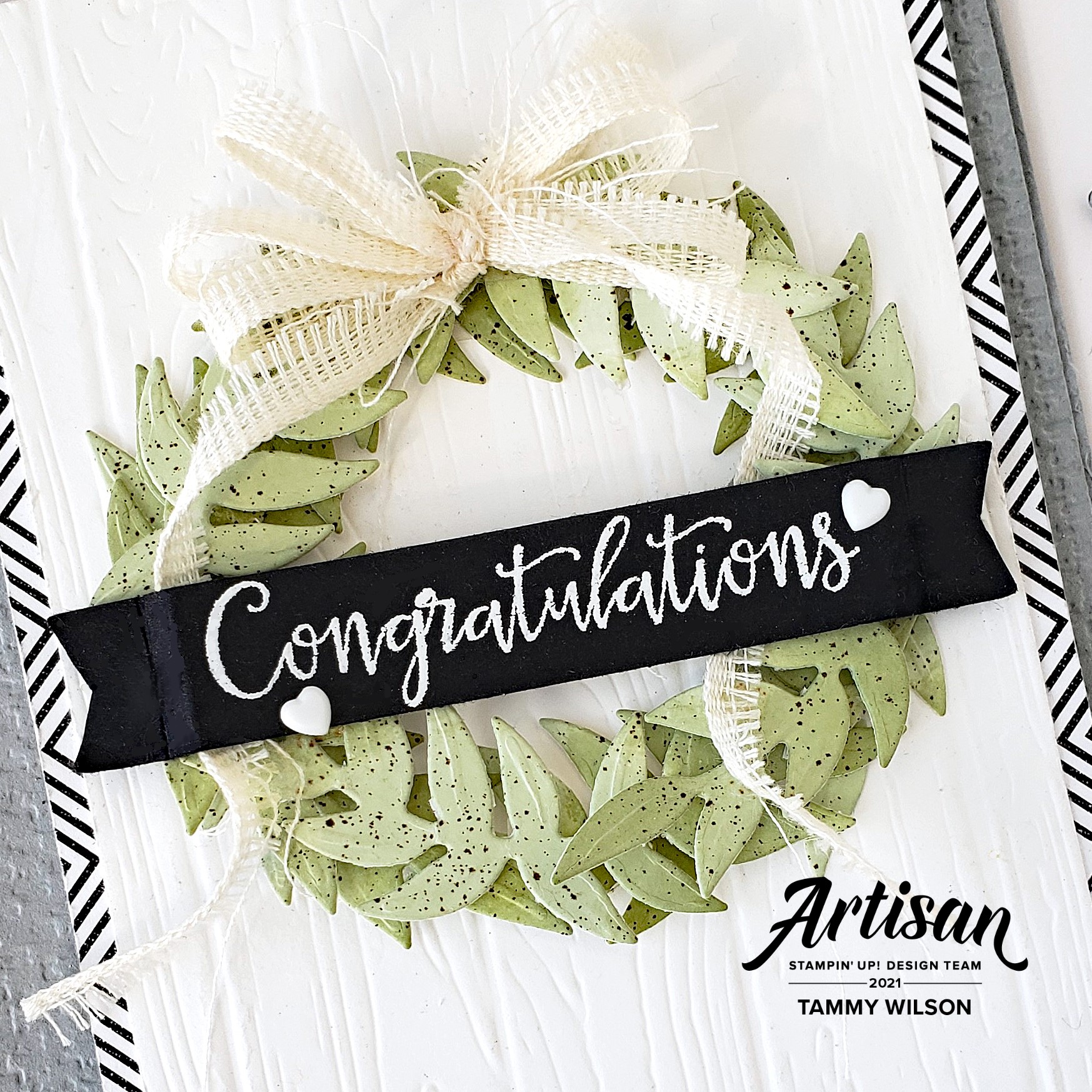 I added the branches in layers. For the bottom layer, I overlapped four branches to create a circular shape, and adhered them directly to the card base. For the second layer, I repeated this process, but I “offset” the branches just a bit, and popped them up with a few Mini Stampin’ Dimensionals. I cut a few leaves from another branch, just to fill in a few areas.