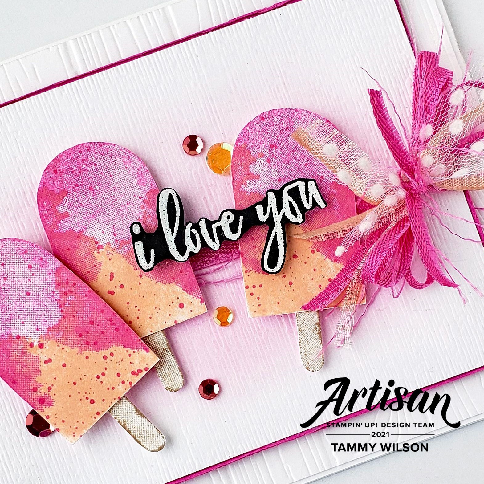 The sentiment (from the Ridiculously Awesome Stamp Set) was heat-embossed on Basic Black Cardstock, using my Versamark Pad and White Stampin’ Emboss Powder. After I cut out the sentiment, I popped it up with a few Mini Stampin’ Dimensionals. For some fun texture, I added some Magenta Madness 2020-2022 In Color Ribbon, Petal Pink Striped Organdy Ribbon, and Whisper White Polka Dot Tulle Ribbon. For a bit of bling, I sprinkled on several of the Artistry Blooms Adhesive-Backed Sequins.