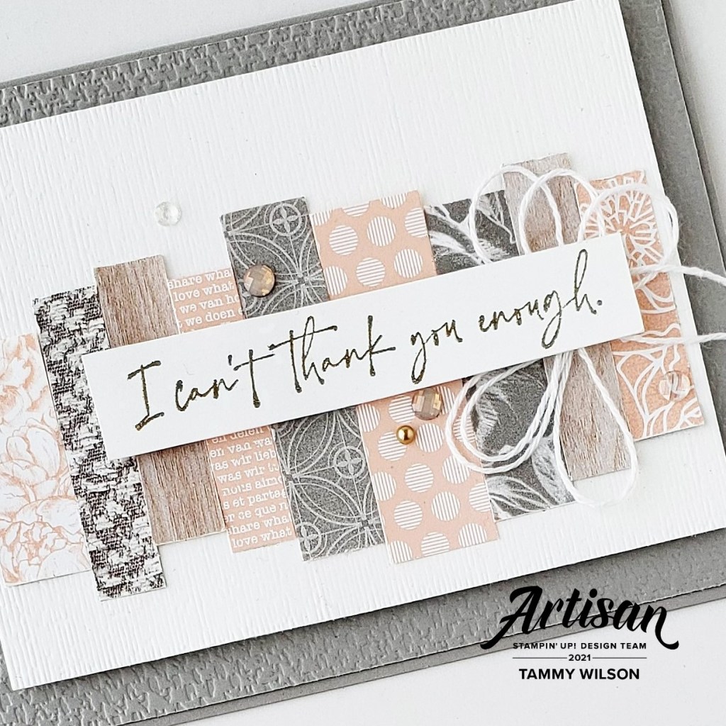 04.23.2021…..Happy Friday, everyone! Today, I wanted to share a card that I created for a recent Stampin’ Fancy Friday challenge! It was a “Pretty Paper Challenge”, so the team members created projects showcasing some of the fabulous Designer Series Paper collections. The card I created was a great way to use up several of the DSP scraps that I had saved. I hope this inspires you to dig through that scrap box you have, and use up some of your favorite DSP!