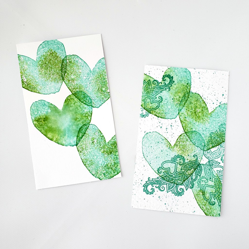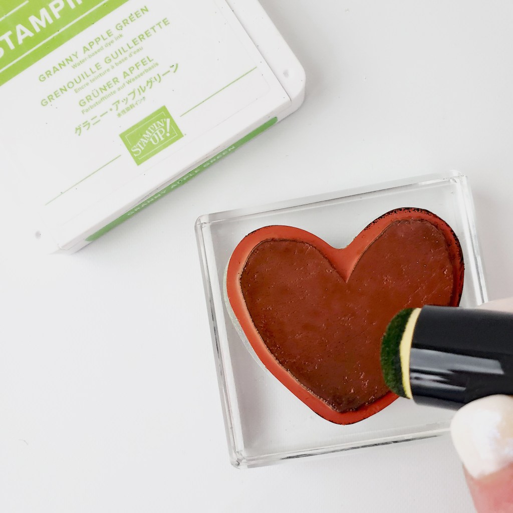 To create each of the hearts for my each of my projects, I stamped the large heart in my Coastal Cabana Classic Stampin’ Pad, and stamped it off once on a paper scrap. I then used a Sponge Dauber, along with my Granny Apple Green Classic Stampin’ Pad, to add a bit of extra color.