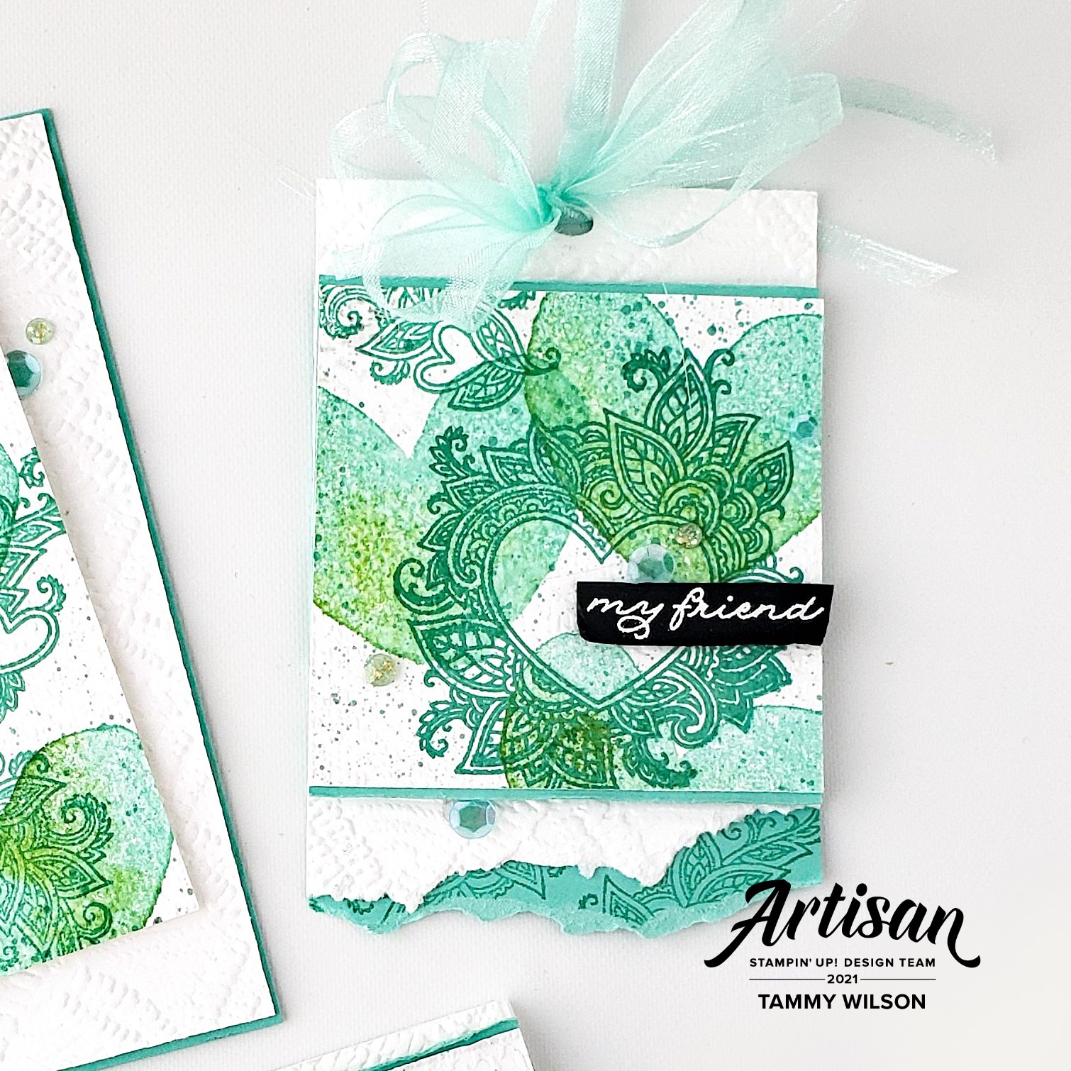 06.07.21…..Happy Tuesday, everyone! Today, I’m sharing a mini tutorial for projects that I recently created for the Stampin’ Up! Corporate Facebook Page, featuring the Henna Hearts Stamp Set, from the brand new Stampin’ Up! 2021-2022 Annual Catalog! To create the sentiments, I paired this stamp set with Ornate Thanks Stamp Set! This new catalog is sooooo jam-packed with soooooo many amazing stamps sets, accessories, and more….and I know your wish list will be overflowing before you know it!