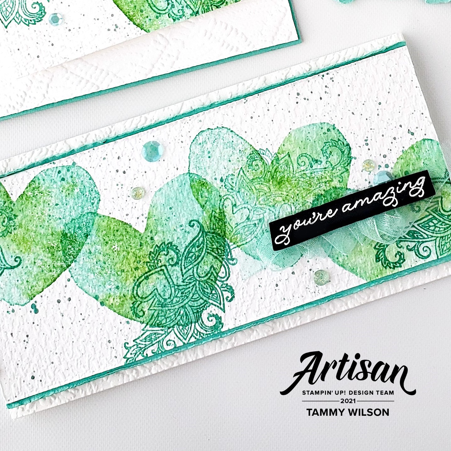 Before I stamped the heart on Basic White Thick Cardstock, I misted it just a bit with a Stampin’ Spritzer. After I stamped each heart, I quickly wiped off the stamp with a paper towel, before I stamped the next one. Once I finished stamping the hearts, I used my Coastal Cabana Classic Stampin’ Pad to add the filigree designs. I then embossed the cardstock with the Tasteful Textile 3D Embossing Folder, and added a bit of speckling with my Light Bermuda Bay Stampin’ Blends Marker. (To create the speckling, I “flicked” the thick end of the marker against the inside edge of the marker cap, and “flicked” outward, towards the cardstock.)