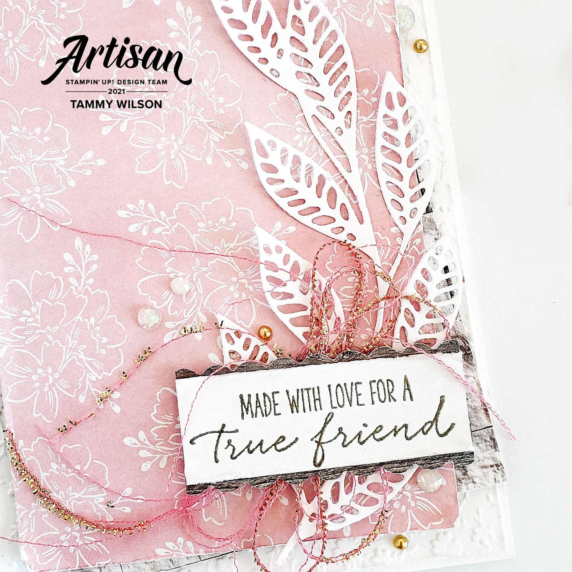 For this card, I started with some Basic White Thick Cardstock, embossed it with the Ornate Floral 3D Embossing Folder, and adhered it to a Basic White Thick Cardstock base. I then layered together some Hand-Penned and In Good Taste Designer Series Paper, and popped them up with a few Stampin’ Dimensionals. The Basic White Thick Cardstock leaves were created with one of the Artistic Dies (…one of my favs!).