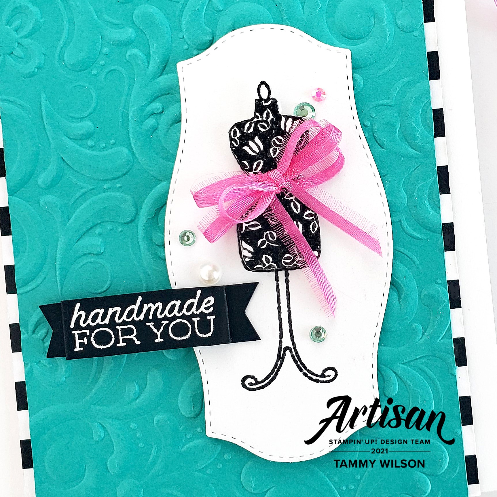 I heat-embossed the mannequin stand (from the Handmade for You Stamp Set) two times on Basic White Thick Cardstock, using my Versamark Pad and Black Stampin’ Emboss Powder. I cut out one of the mannequin stands, using one of the Tasteful Labels Dies, and popped it up with a few Stampin’ Dimensionals. To add some extra dimension to the card, I cut out just the “body” of the second mannequin stand, and popped it up with a few more Stampin’ Dimensionals.