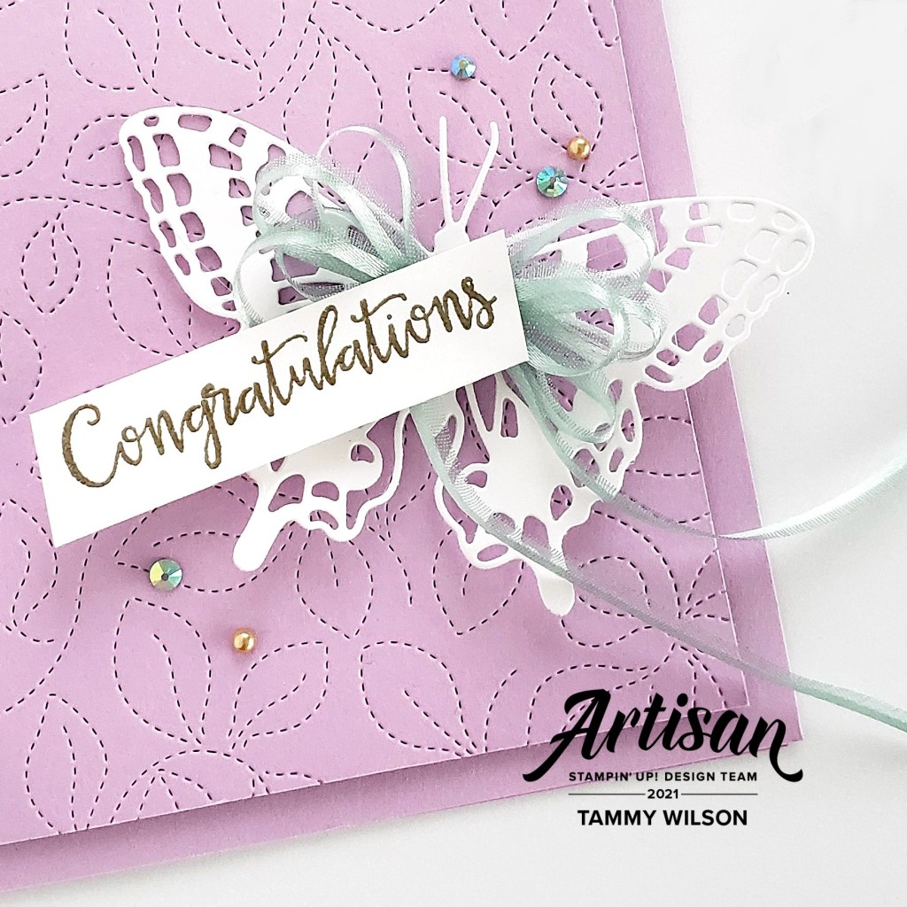 For this card, I started with some Fresh Freesia Cardstock, die cut it with the Stitched Greenery Die, and used a few Stampin’ Dimensionals to adhere it to a Fresh Freesia Cardstock base. I then used some Basic White Thick Cardstock, along with one of the Brilliant Wings Dies, to cut out the butterfly.