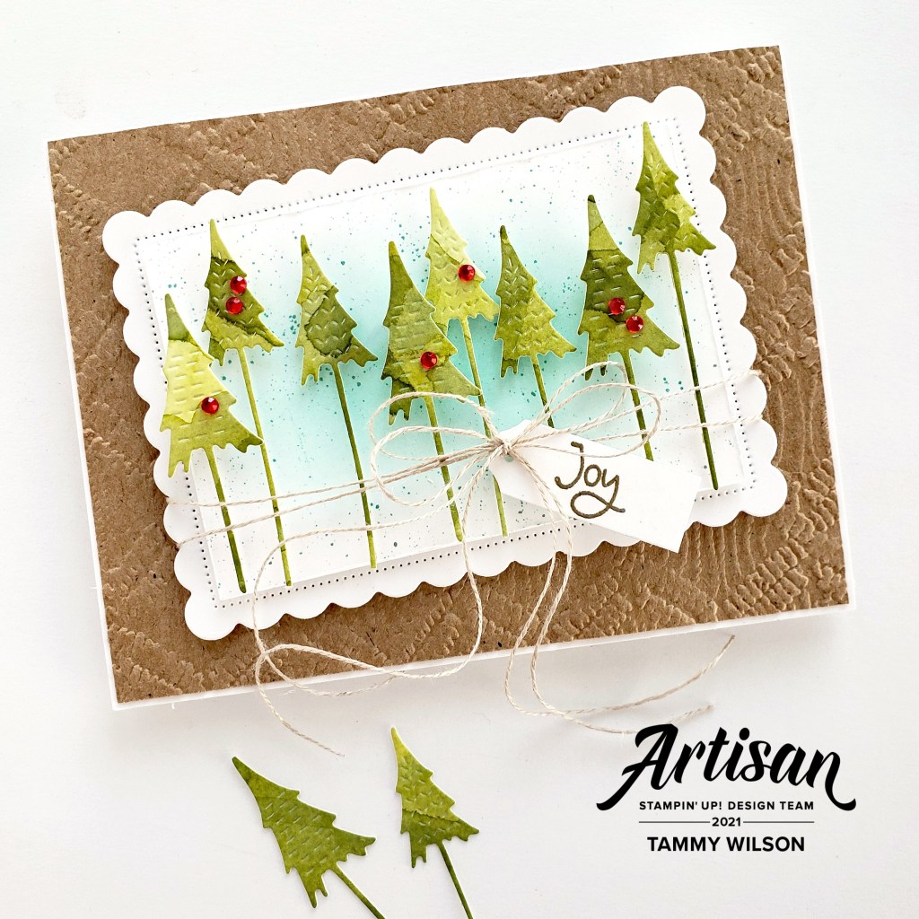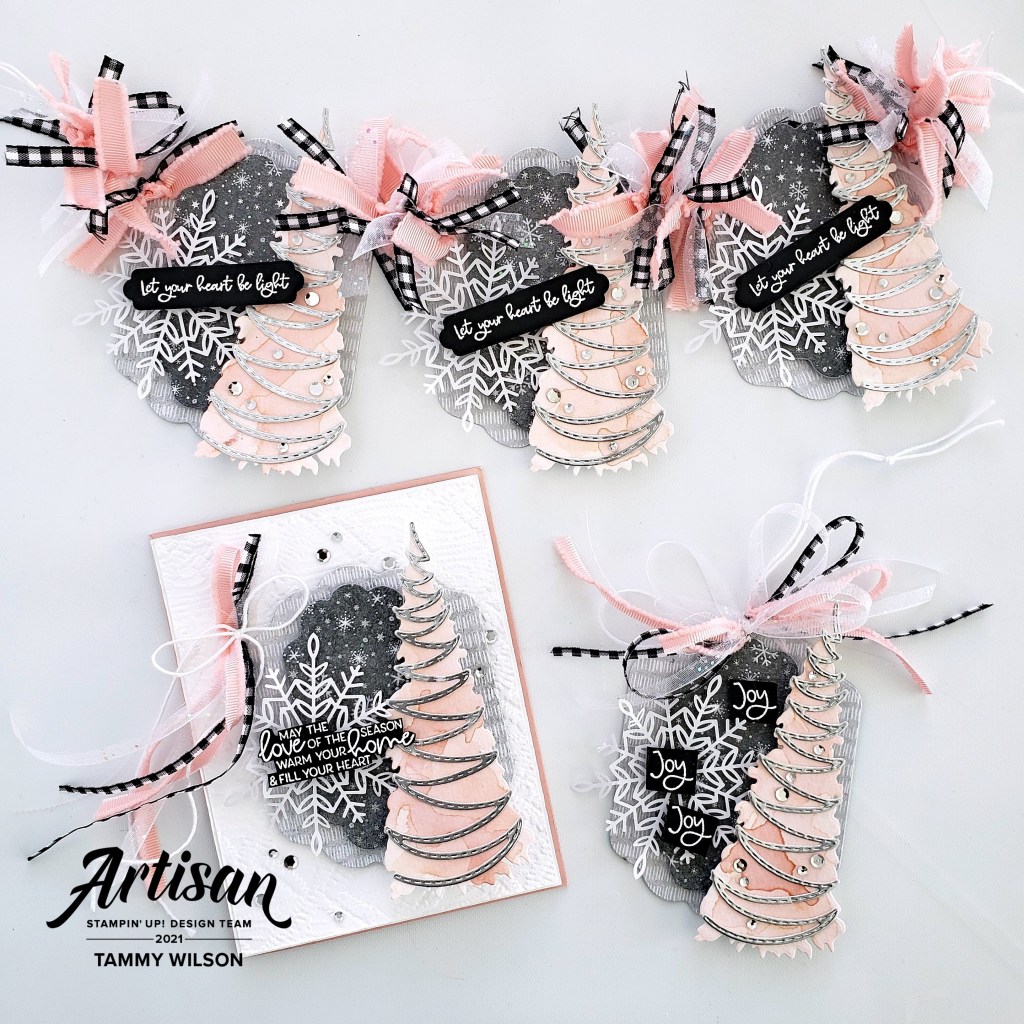 06.07.21…..Happy Friday, everyone! Today, I’m sharing a mini tutorial for projects that I recently created for the Stampin’ Up! Corporate Facebook Page. With a touch of “shabby-chic” inspiration, I used the Whimsical Trees Bundle, Seasonal Labels Dies, and Peaceful Place Designer Series Paper to create my banner, card, and gift tag. By adding a variety of ribbon, along with the Subtle Shimmer Sequins, I stepped up the “shabby-chic” look just a bit more.