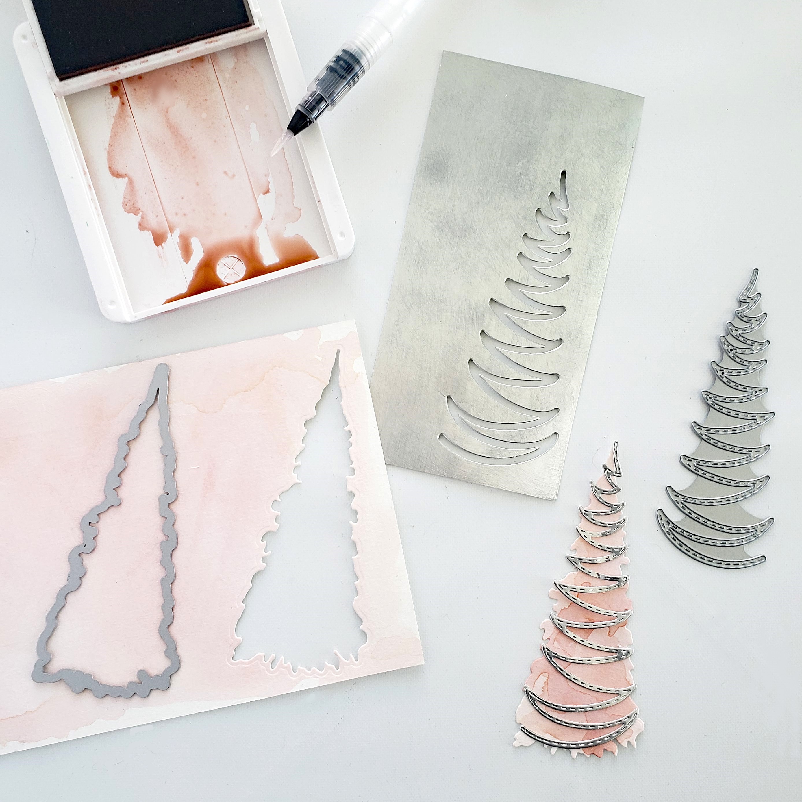 To create the trees, I started with Fluid 100 Watercolor Paper, and added a wash of color using my Blushing Bride Classic Stampin’ Pad and a Water Painter. After I dried the paper with a Heat Tool, I cut out the trees with one of the dies from the Whimsical Trees Bundle.