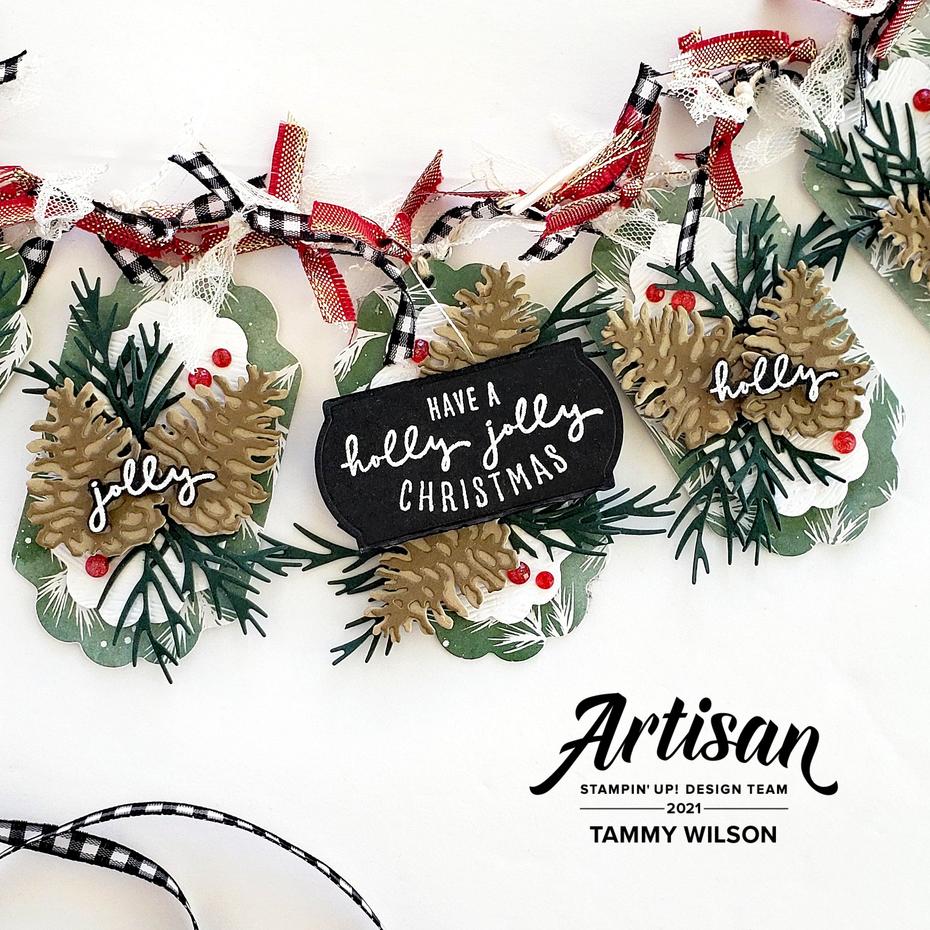 The base for each layered label was created with two of the dies from the Christmas Season Bundle, Basic White Thick Cardstock, and one of the patterns of paper from the Painted Christmas DSP. The smaller Basic White Thick Cardstock label was also embossed with the Timber 3D Embossing Folder. I then used a few Stampin’ Dimensionals to adhere the smaller label to the larger label.