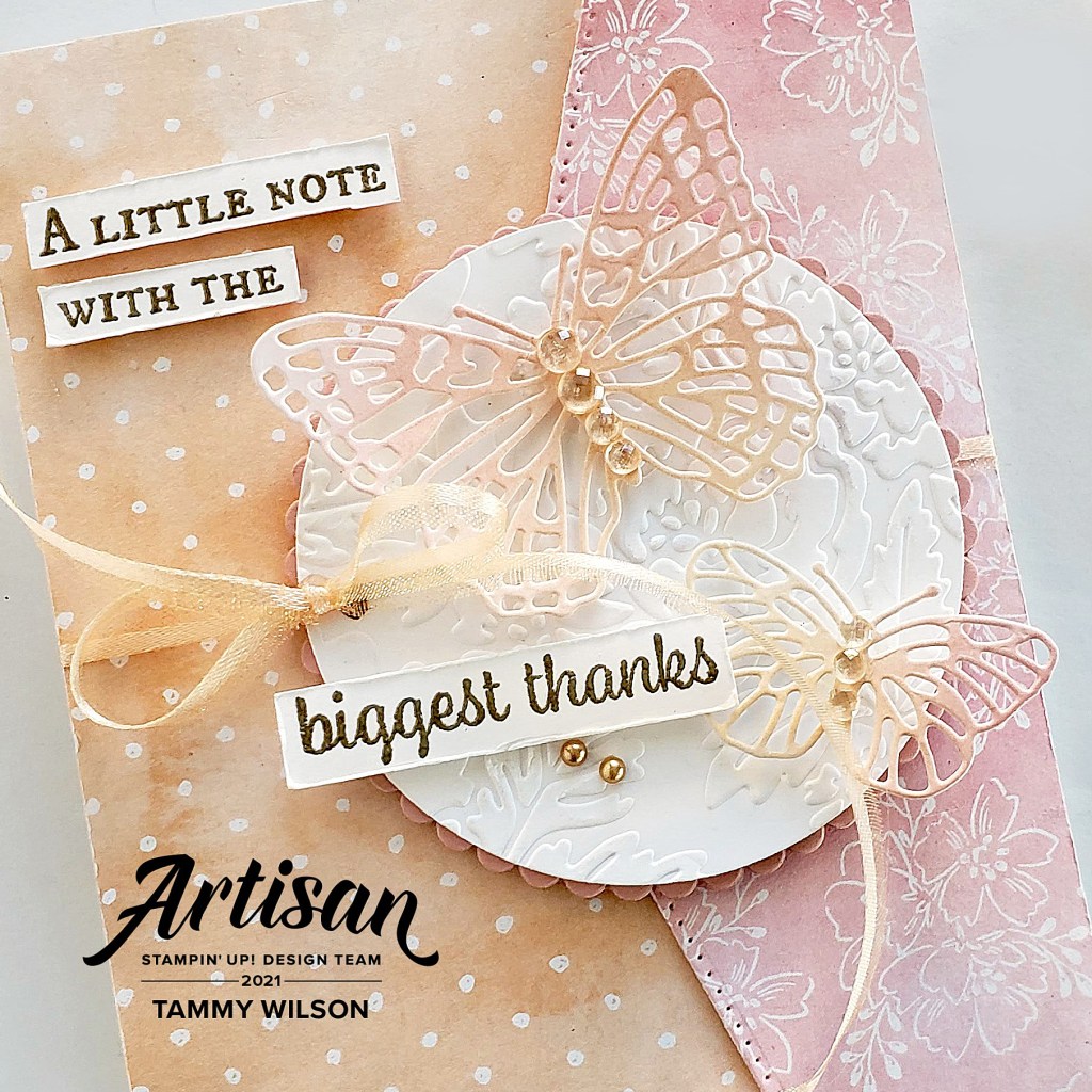 To create the butterflies, I used my Blending Brushes to add a bit of Pale Papaya and Blushing Bride to some Basic White Thick Cardstock. I then cut out the butterflies with the Brilliant Wings Dies. For a bit of bling, I added Elegant Faceted Gems and gold Metallic Pearls.