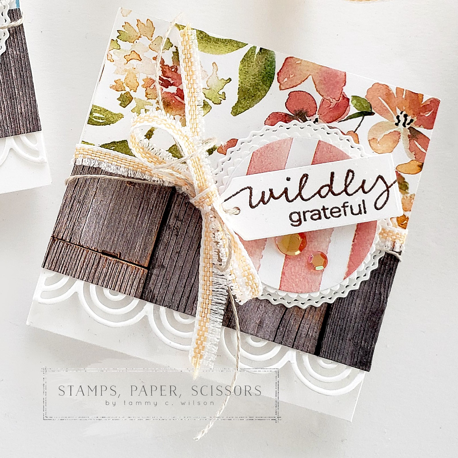I created the bow some Pale Papaya & White Ribbon (cut in half lengthwise) and Linen Thread. For a bit of bling, I sprinkled on Artistry Blooms Adhesive-Backed Sequins.