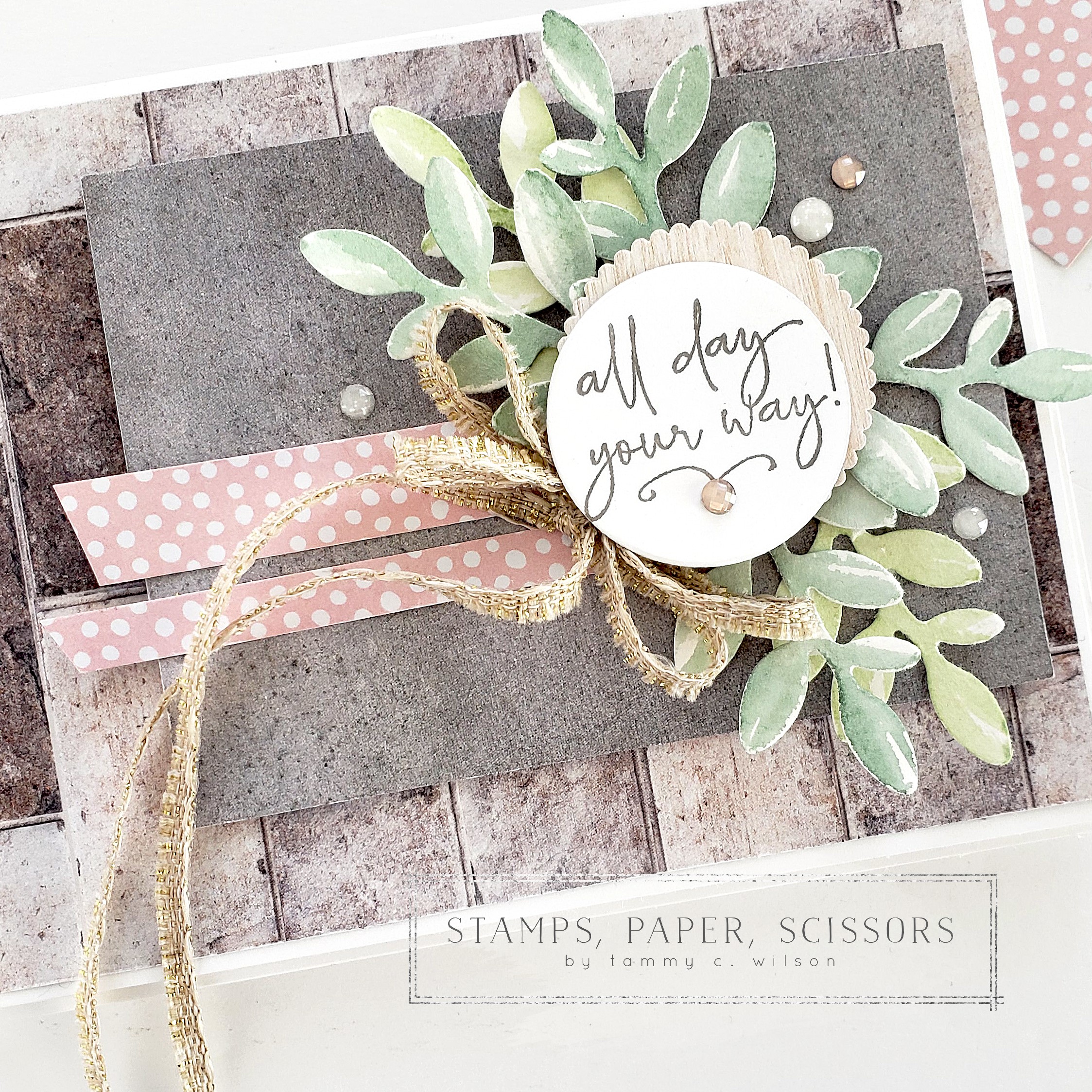 To create the leaves, I used Fluid 100 Watercolor Paper, and punched them out with the Bough Punch. To watercolor the leaves, I used a Water Painter, along with Soft Succulent and Soft Sea Foam.