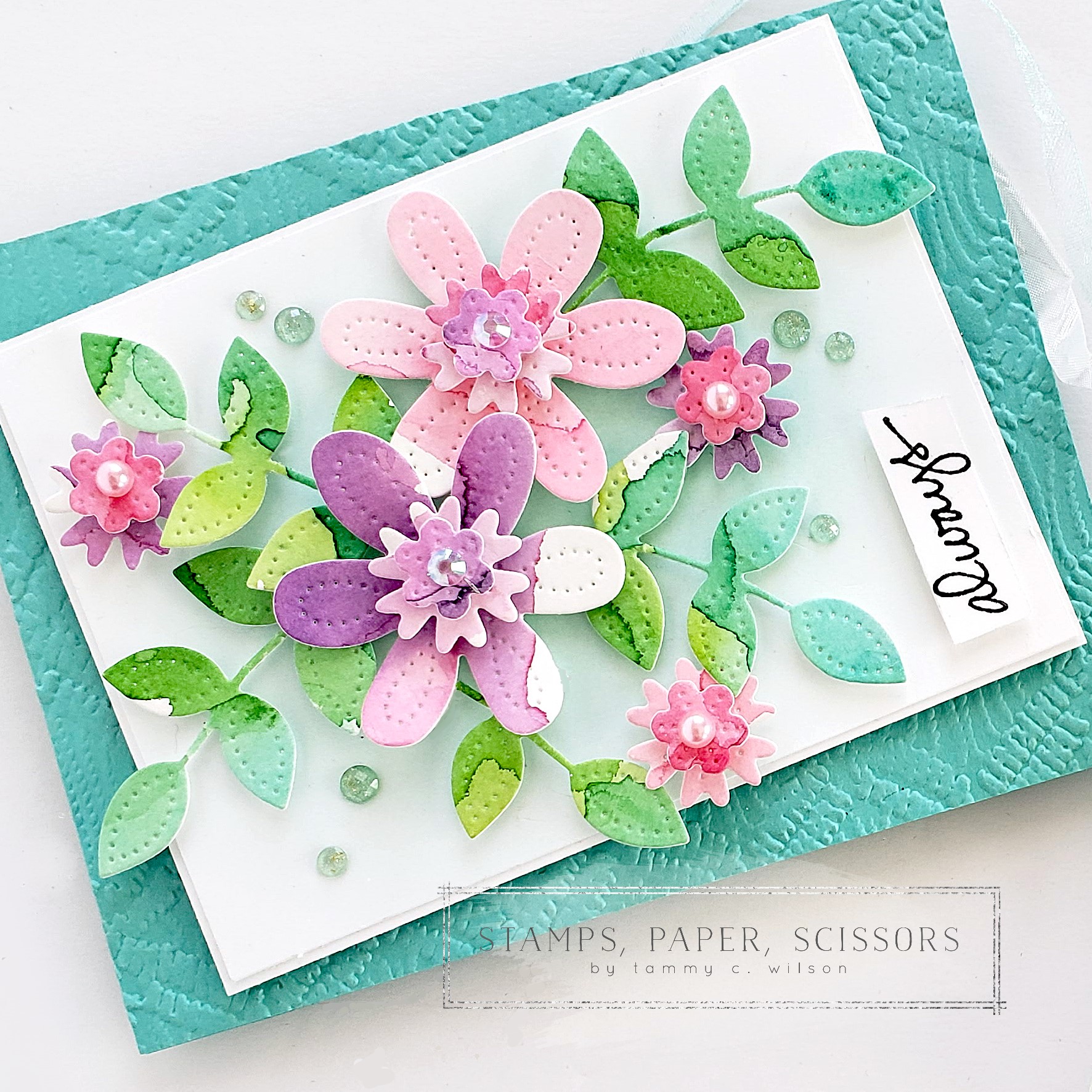 After I added all of the flowers and leaves, I added a sentiment from the Lovely You Stamp Set. I used my Versamark Pad and Black Stampin’ Emboss Powder to heat-emboss the sentiment, and popped it up with Mini Stampin’ Dimensionals. To create the bow, I used Pool Party Sheer Ribbon (cut in half lengthwise) and White Crinkled Seam Binding Ribbon. For a bit of bling, I sprinkled on Genial Gems, Pastel Pearls, and Iridescent Rhinestone Basic Jewels.