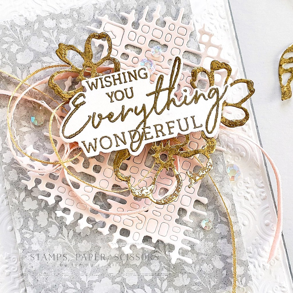For the next layer, I used a Blending Brush to add some Petal Pink to a piece of Basic White Thick Cardstock, and cut out the woven grid shape with one the new Chic Dies. To create the gold flowers, I used the new Distressed Gold Specialty Paper, along with a few more of the Chic Dies.