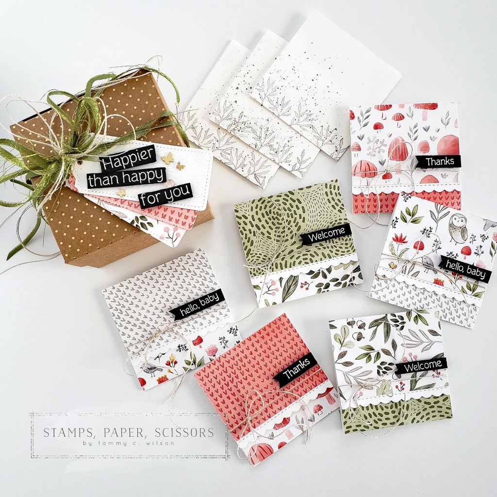 For my new products, I chose the adorable Happy Forest Friends Suite. There are so many wonderful images in this set, not to mention the Happy Forest Friends Designer Series Paper. For my returning products, I chose the Scalloped Contours Dies and the Scalloped Kraft Treat Boxes. And….my little 3″ x 3″ notecards fit just perfectly in the treat box!