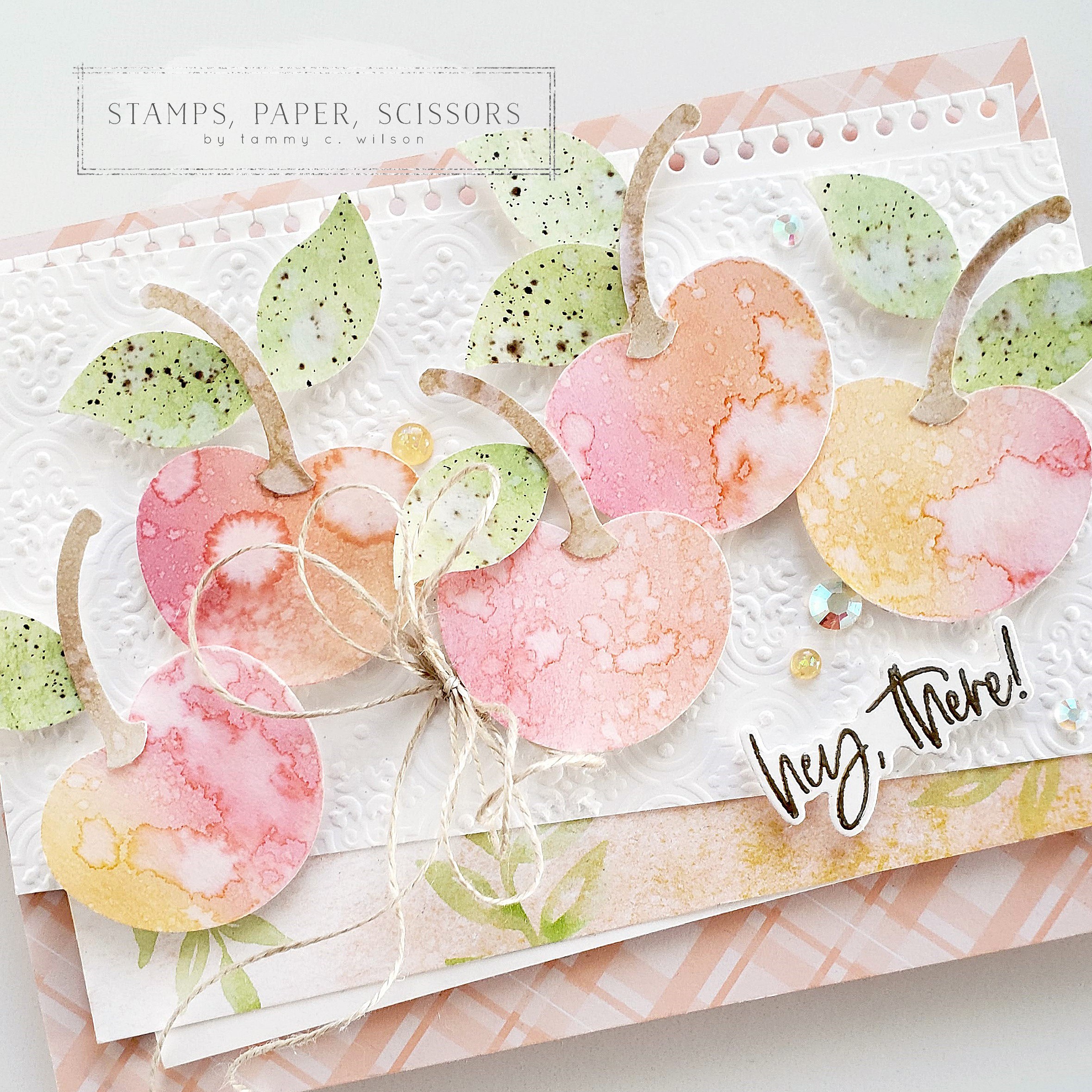 To create the cherries, I used Blending Brushes to add Polished Pink, Petal Pink, and Mango Melody to some with Basic White Thick Cardstock. I then used the Water Painter, to add some water droplets. Once the cardstock was dry, I punched out the cherries with the Cherry Builder Punch. For the stems and the leaves, I used the same technique, but with Crumb Cake for the stems, and…Mint Macaron and Soft Sea Foam for the leaves. I also used my Early Espresso Stampin’ Write Marker to add speckling to the leaves. (To create the speckling, I “flicked” the thick end of the marker against the inside edge of the marker cap, and “flicked” outward towards the cardstock.)
