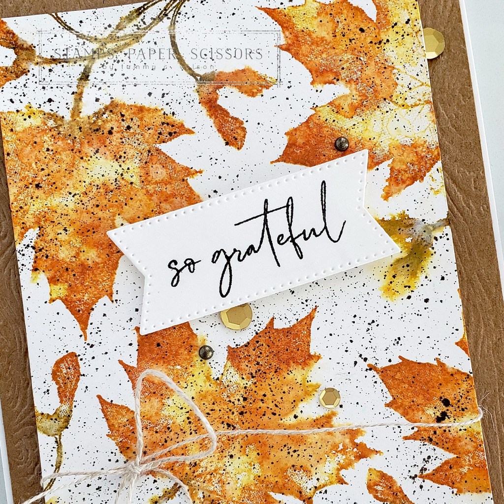 To create the multi-colored leaves, I stamped the large leaf stamp (from the Soft Seedlings Stamp Set) in Crushed Curry, and “stamped off” once, on a piece of scrap paper. (I did not stamp on the cardstock yet.) I then used Sponge Daubers to randomly add Pumpkin Pie and Soft Suede to the leaves and stems, and then I stamped on the Basic White Cardstock. I repeated this process three or four times, cleaning off the stamp in between, before I placed the stamp in Crushed Curry again.
