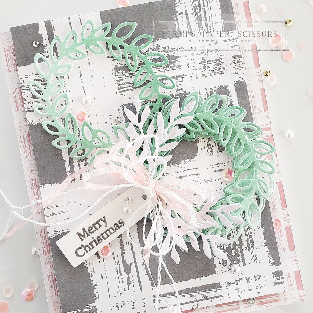 To create the wreaths, I used a Blending Brush to add soft swirls of Mint Macaron to some Basic White Thick Cardstock. I then used the wreath dies (from the Cottage Wreaths Bundle) to cut out three wreaths. I layered two of the wreaths together, and added the third one by itself. The little branches were cut from White Glimmer Paper, using dies from the Cottage Wreaths Bundle.