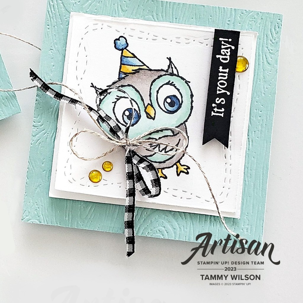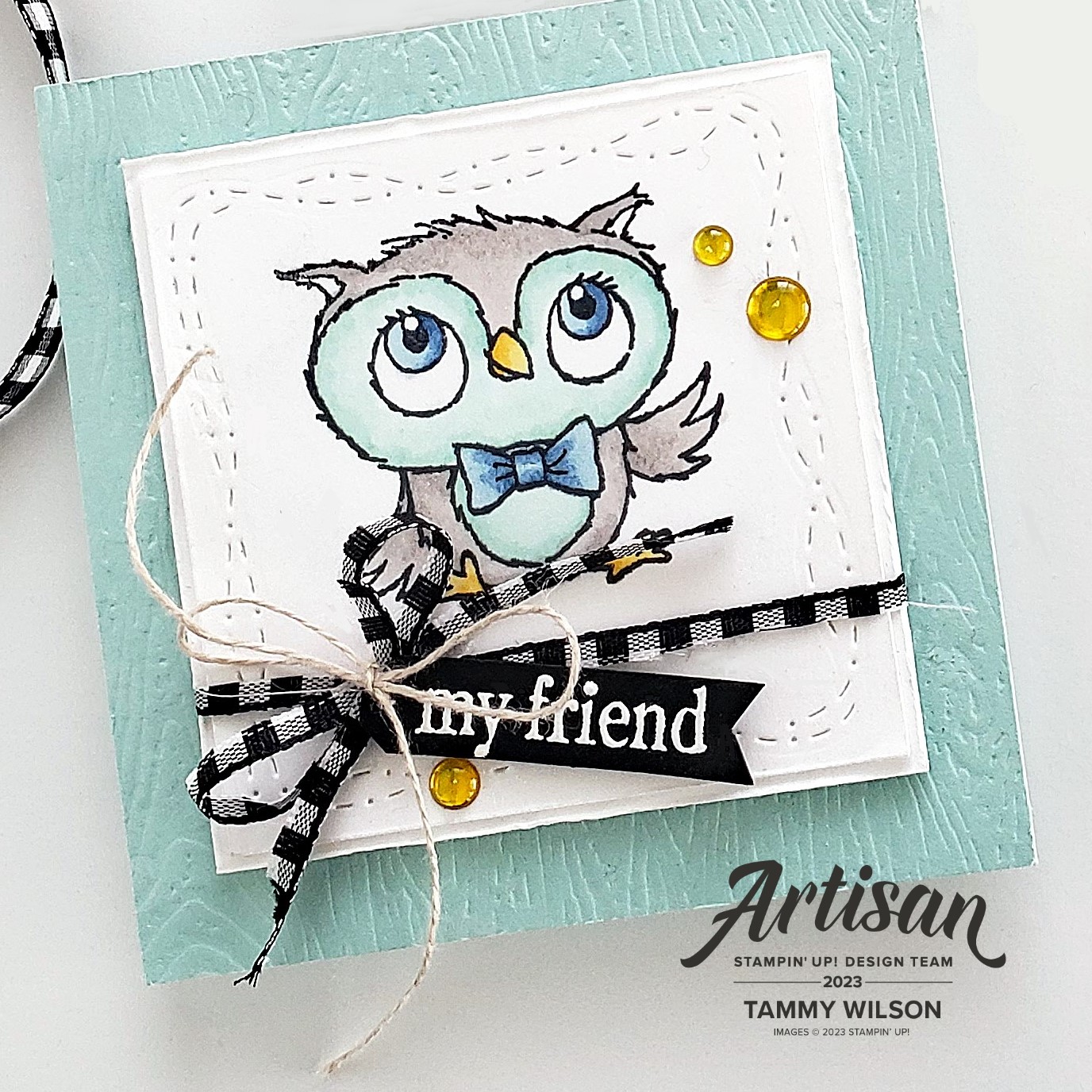 I used the following Stampin’ Blends Marker Combo Packs to color each of the owls…..Pool Party, Night of Navy, Gray Granite, and Daffodil Delight. I then layered a slightly larger piece of Basic White Thick Cardstock underneath, and used Stampin’ Dimensionals to adhere them to the card base.