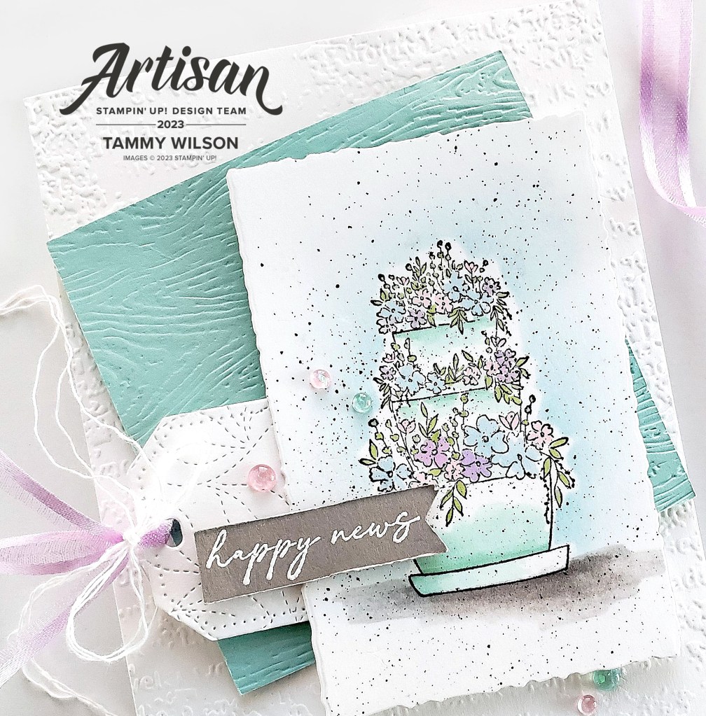 I thought these little flower pots from the Scenic Garden SAB Host Stamp Set, colored with Stampin’ Blends Markers, would be just perfect for this challenge. I’m also obsessed with embossing folders, so I added an extra bit of texture to this card with the Timeworn Type and Timber 3D Embossing Folders. I also used the Stitched Greenery Die, Deckled Rectangles Dies, Fresh Freesia Open Weave Ribbon, and 2021-2023 In Color Opal Rounds.