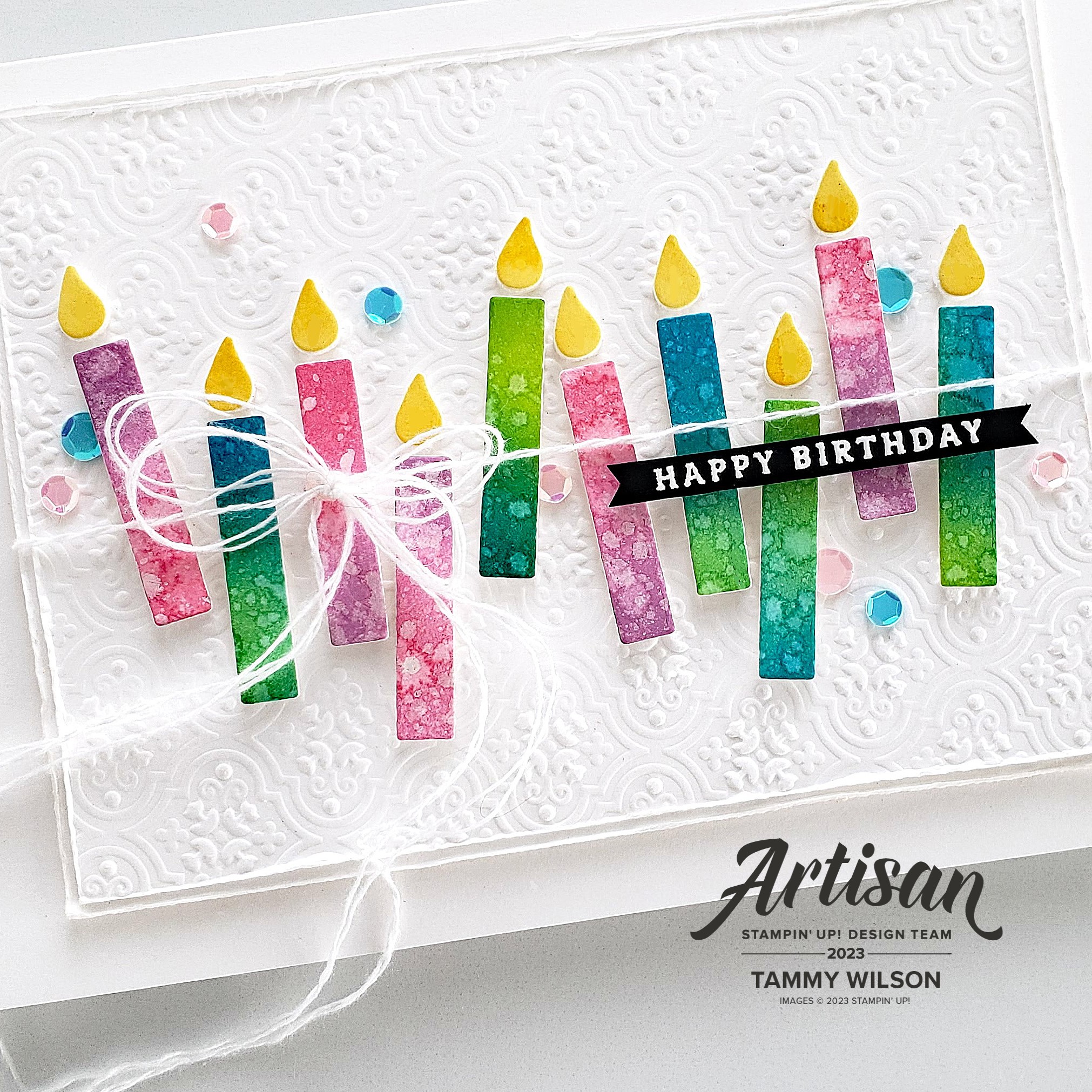 To create the colorful paper for the candles, I used a Blending Brush to add soft swirls of Granny Apple Green, Bermuda Bay, and Pacific Point to some Basic White Thick Cardstock. I also used a Blending Brush to add soft swirls of Polished Pink and Fresh Freesia to another piece of Basic White Thick Cardstock. Next, I used my Water Painter to “flick” water drops across the cardstock, then dried it with a Heat Tool. Once the cardstock was completely dry, I cut out the candles with one of the dies from the Sentiment Silhouettes Dies.