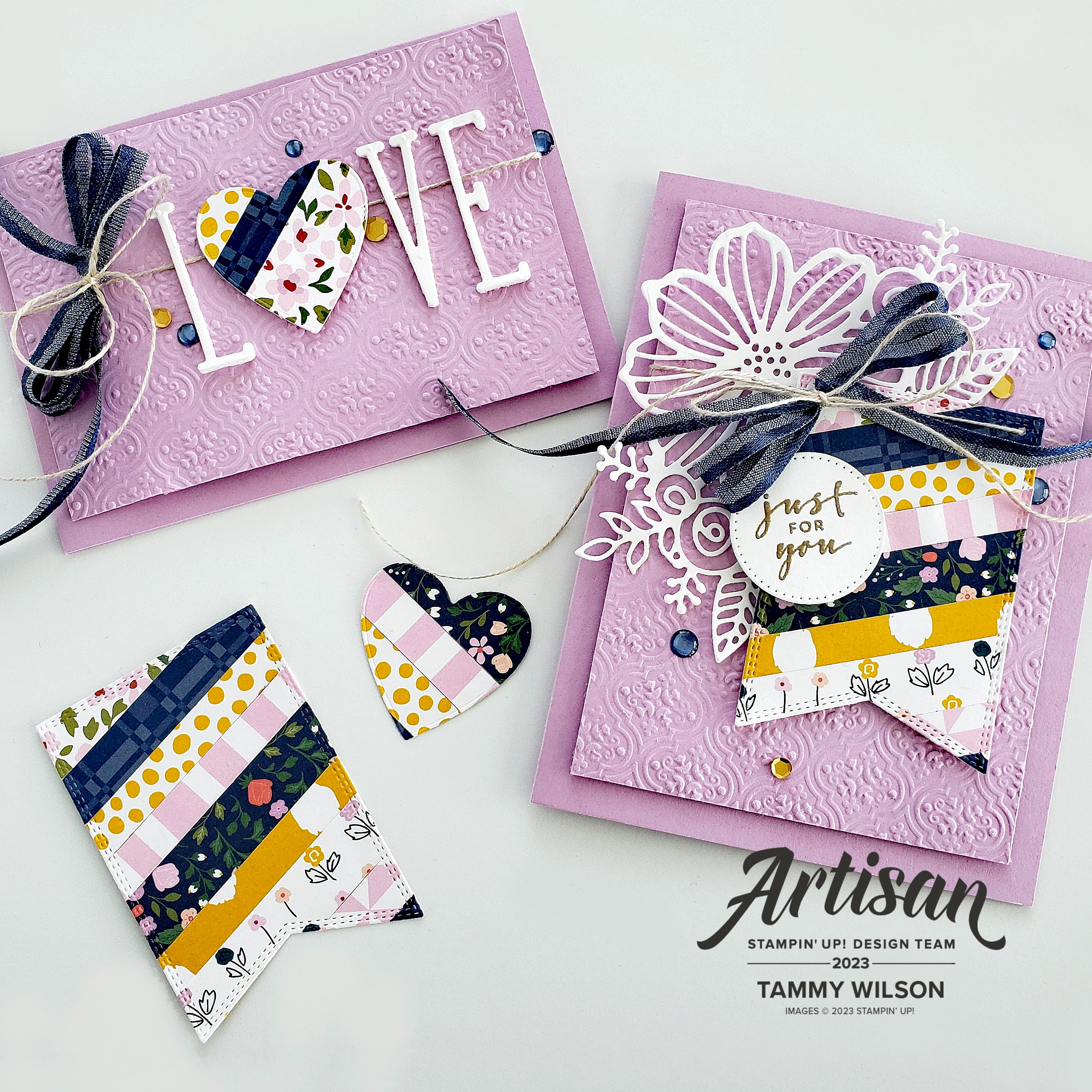 03.24.2023…..Happy Wednesday, everyone! Today, I wanted to share my newest Technique Tuesday [post, as a member of the Stampin’ Up! 2023 Artisan Design Team. For my post, I decided to share how you can create your own colorful, unique paper for die cutting shapes, using strips of your favorite Designer Series Paper. For these projects, I used the colorful, trendy Delightfully Eclectic DSP.
