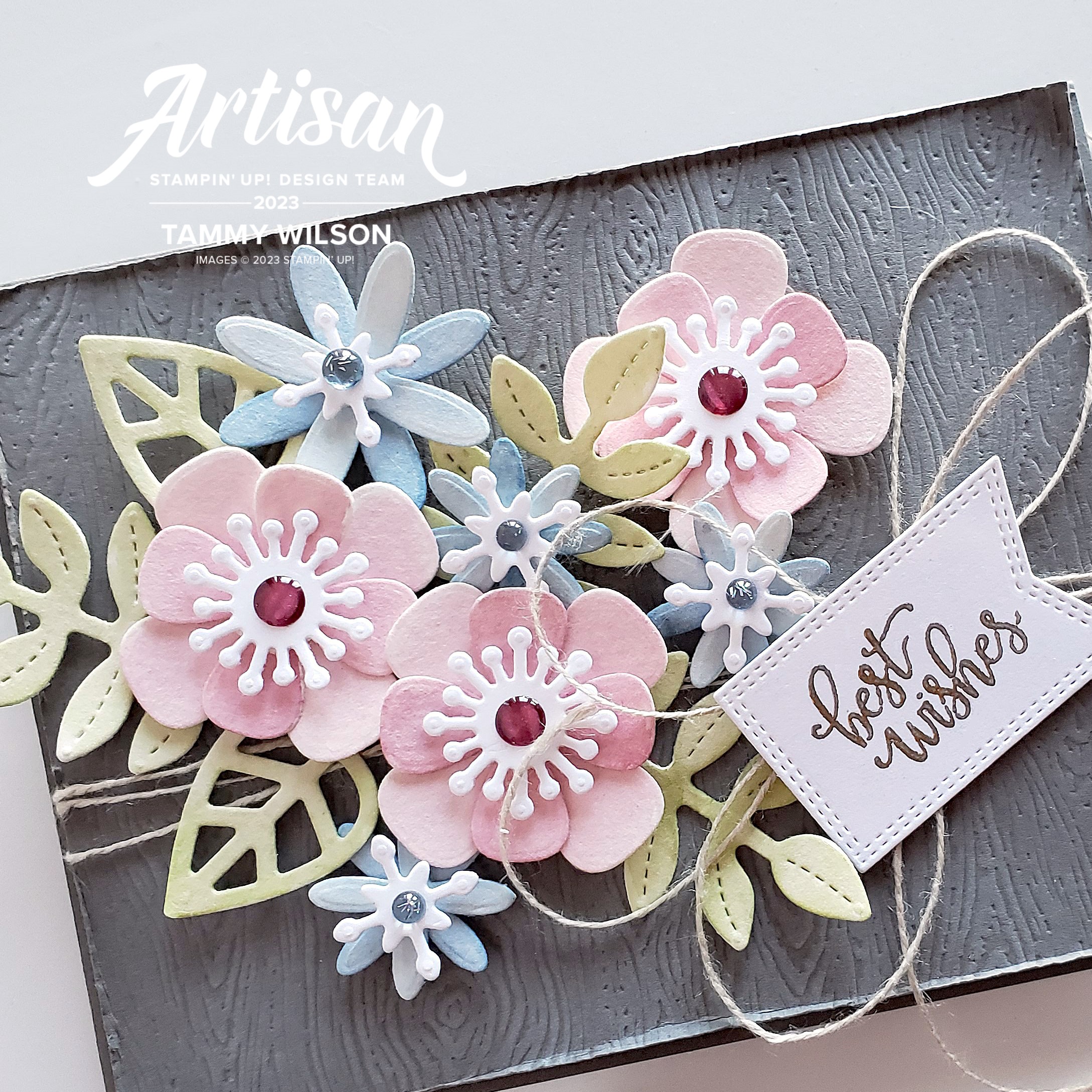 05.15.2023…..Happy Monday, everyone! The new Stampin’ Up! 2023-2024 Annual Catalog is jammed packed with sooooo many wonderful products, and…..one of my favorites is the new Paper Florist Dies! I combined them with some watercolored paper to create all of the flowers and leaves for this card. I hope this card inspires you to create some wonderful projects of your own, using some of the amazing new products from this catalog!