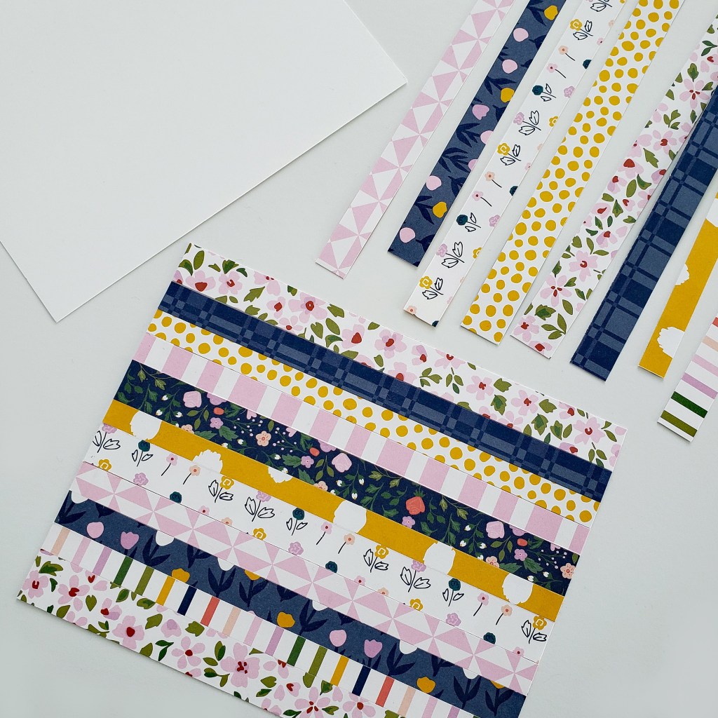 Step 1: Cut several strips of Designer Series Paper (approximately ¼” to ½” width), using a variety of patterns and colors. You may also want to use strips that you already have on hand. Use your favorite adhesive to adhere the strips to Basic White Cardstock.