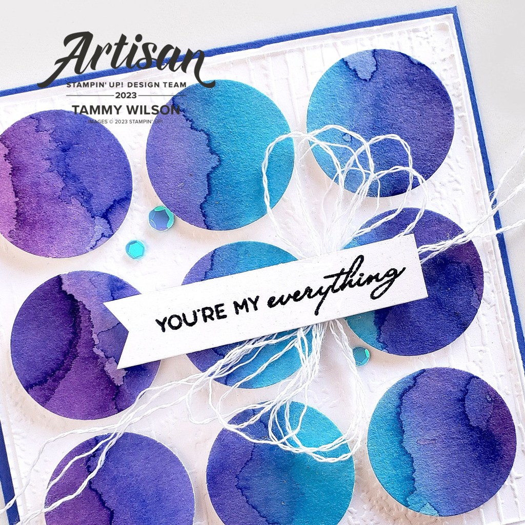To create the dots, I used a Water Painter to add Tahitian Tide, Orchid Oasis, and Gorgeous Grape to Fluid 100 Watercolor Paper. To cut out the dots, I used one of the circle dies from the Reach for the Stars Dies, then popped them up with Stampin’ Dimensionals.