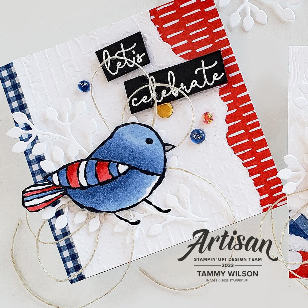 07.04.2023…..Happy 4th of July, everyone! I’m a bit obsessed with the Bird’s Eye View Stamp Set, so of course I had to make some little 3″ x 3″ patriotic cards with it! It is just such a fun, whimsical set, and you can personalize for any occasion by adding your favorite sentiments. Hope these little cards inspire you to create some cards or projects with this stamp set as well!