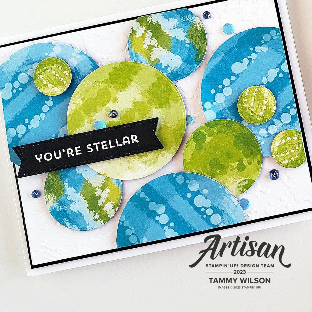 The planets were die cut from the Stargazing Designer Series Paper, using the coordinating dies from the Reach for the Stars Bundle. After I decided on how I was layering them, I popped them up with Stampin’ Dimensionals. The sentiment (from the Reach for the Stars Bundle) was heat-embossed on Basic Black Cardstock, using my Versamark Pad and White Stampin’ Emboss Powder. After I cut out the sentiment with one of the Stylish Shapes Dies, I popped it with a few Mini Stampin’ Dimensionals. For a bit of bling, I sprinkled on Tinsel Gems and Pastel Adhesive-Backed Sequins.