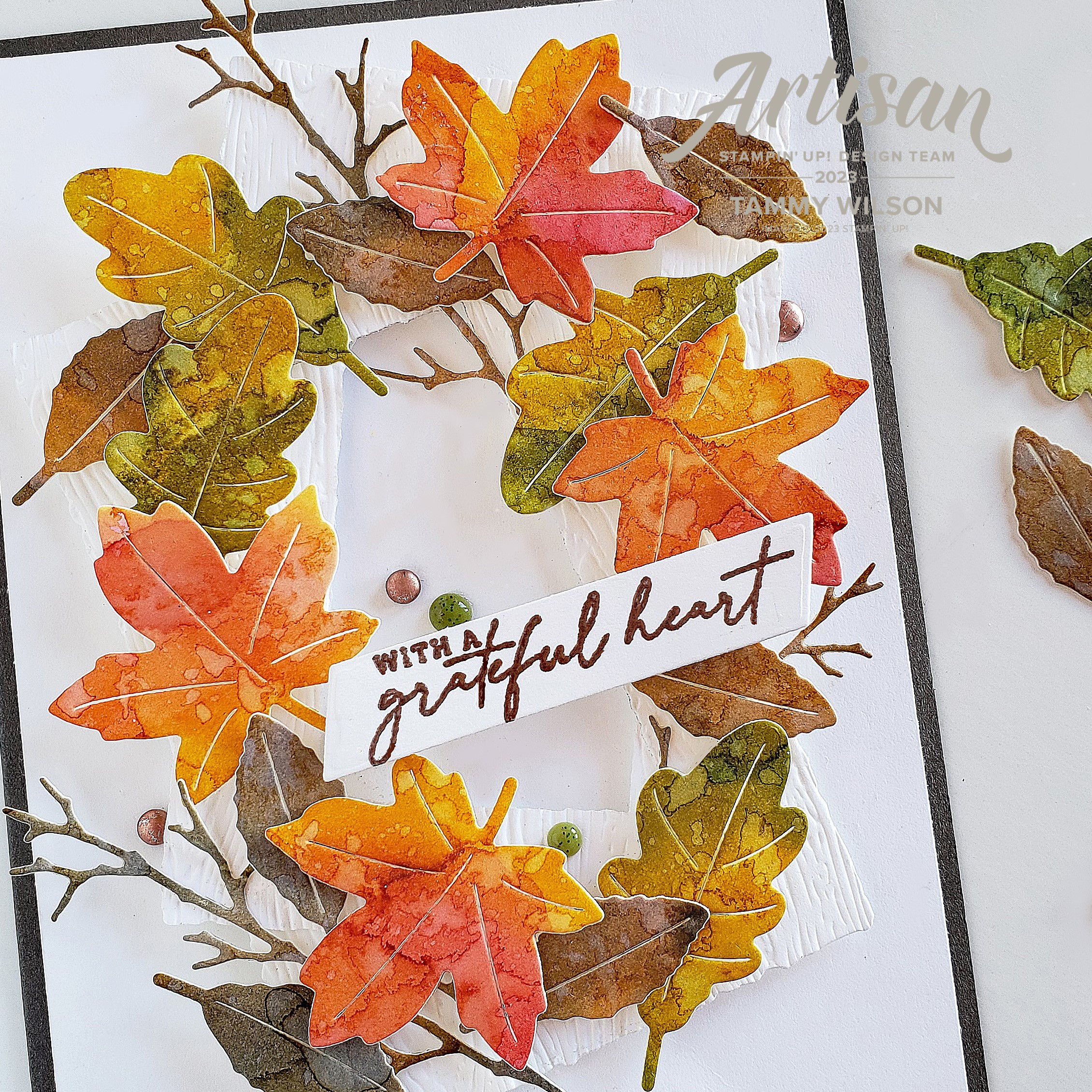 To create the largest leaves, I used a Blending Brush to add random swirls of Crushed Curry, Pumpkin Pie, and Cherry Cobbler to Basic White Thick Cardstock. I then used a Water Painter to splatter droplets on the cardstock. After I dried the paper with a Heat Tool, I used the larger leaf die (from the Autumn Leaves Bundle) to cut out four leaves. For the medium leaves, I used the same steps, along with Crushed Curry and Old Olive. For the smaller leaves, I used the same steps, along with Pecan Pie and Pebbled Path. For the branches, I used one of the dies from the Seasonal Branches Bundle, along with Pecan Pie and Pebble Path.