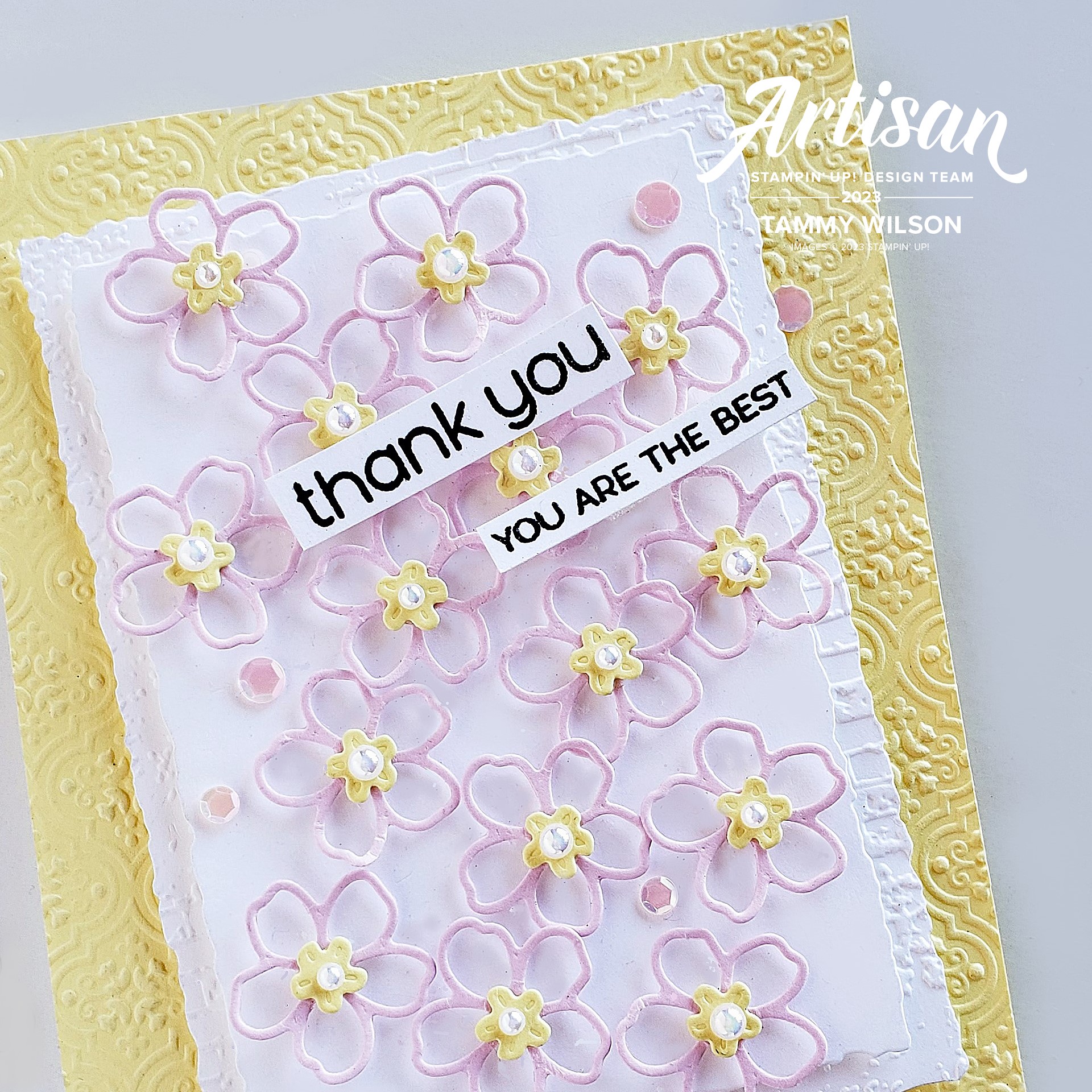 The sentiments (from the Timeless Arrangements Stamp Set) were heat-embossed on Basic White Thick Cardstock, using my Versamark Pad and Black Stampin’ Emboss Powder. For a bit of bling, I sprinkled on Pastel Adhesive-Backed Sequins and Iridescent Pearl Basic Jewels.