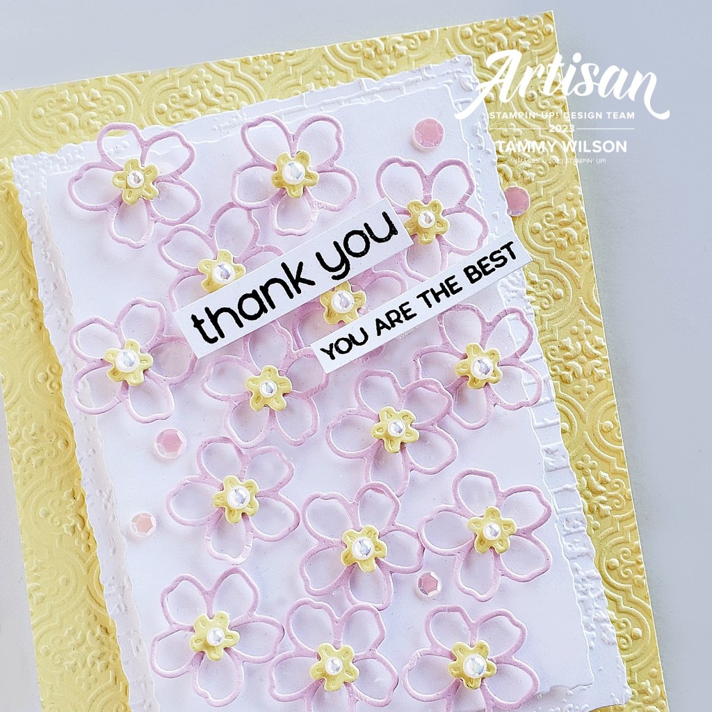 I always love a sketch challenge. I’m also totally obsessed with two of the new SU colors…..Lemon Lolly and Bubble Bath. So, of course I had to use those colors for this month’s challenge. To die cut the flowers, I used the Sentimental Park Dies, and then used the Exposed Brick 3D EF and the Quatrefoil Tile EF to add some extra texture.