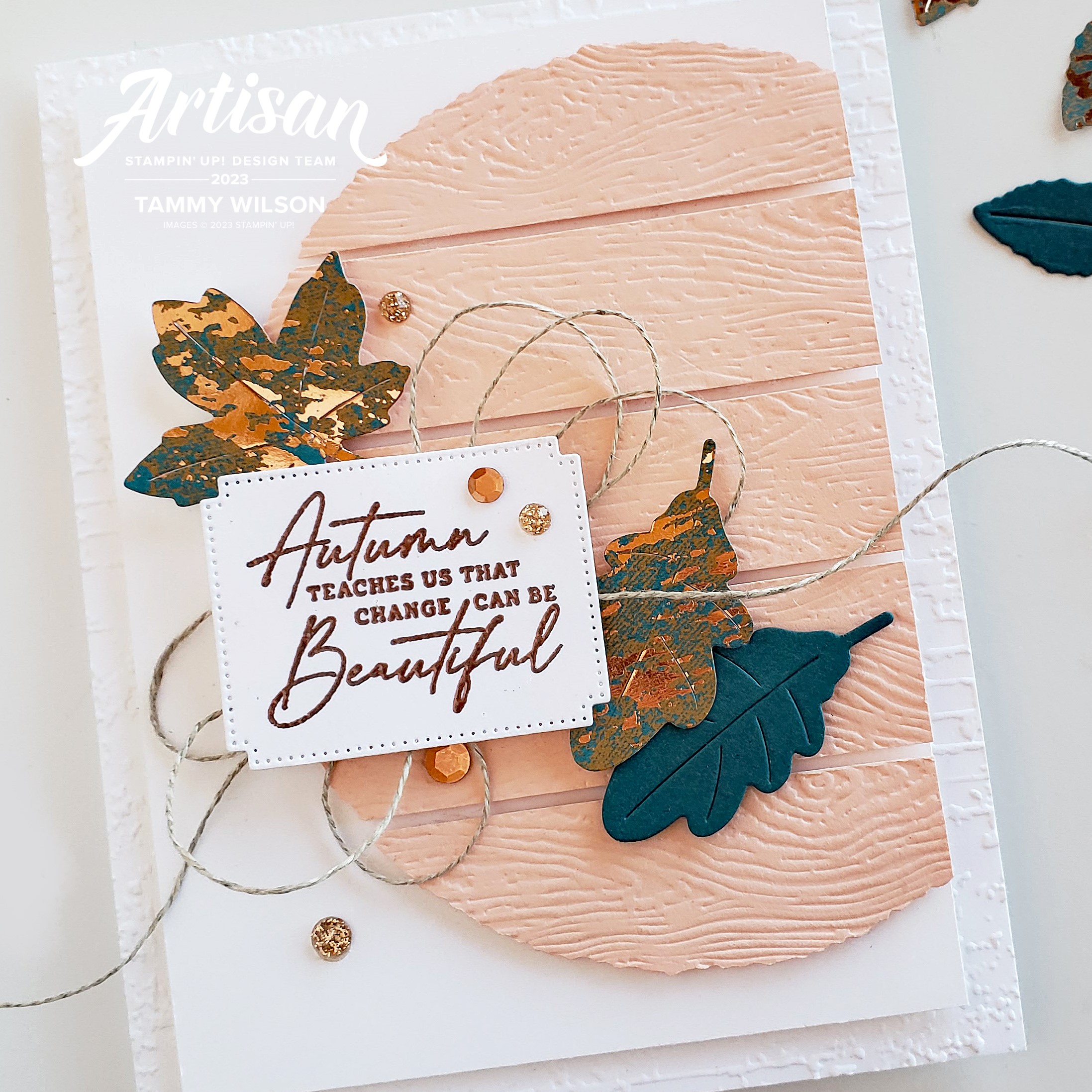 To create the circle, I used of one the Deckled Circles Dies, along with Petal Pink Cardstock. I then trimmed off a bit of the right side of the circle, and embossed it with the Timber 3D Embossing Folder. After I cut the remaining circle into five strips, I popped up each strips with Stampin’ Dimensionals. I also used a couple of the dies from the Autumn Leaves Bundle, and cut out two leaves from the Oxidized Copper Specialty Designer Series Paper, and one from Pretty Peacock Cardstock.
