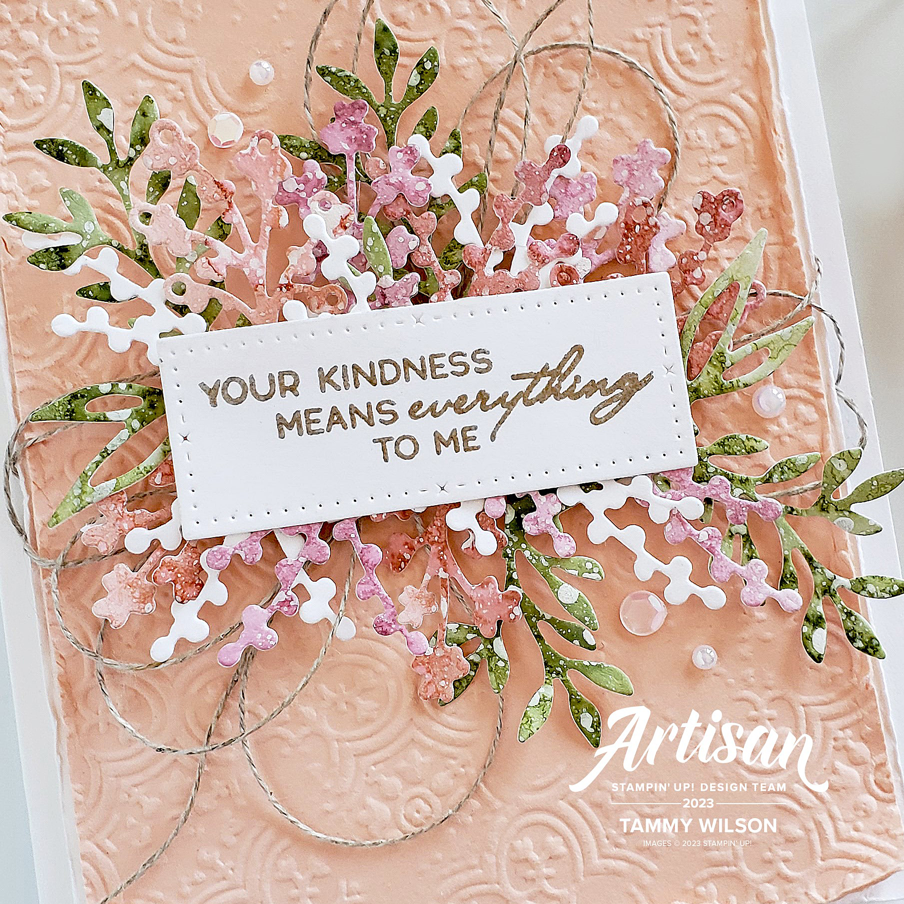 For this card, I started with Petal Pink Cardstock, embossed it with the Distressed Tile 3D Embossing Folder. After and layered some Basic White Thick Cardstock underneath. Next, I wrapped some Linen Thread around the panel, and added a bow as well. I then used Stampin’ Dimensionals to adhere the entire panel to a Basic White Thick Cardstock base.