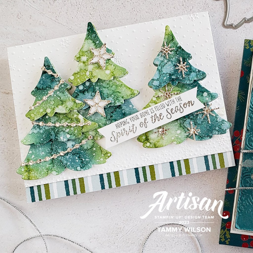 10.18.2023…..Happy Wednesday, my stampin’ friends! Today, I’m sharing my October 2023 Artisan Design Team projects, using the whimsical Merriest Trees Bundle (from the Stampin’ Up! September – December 2023 Mini Catalog), along with the Walk in the Forest Designer Series Paper. This is such a festive bundle, with wonderful images, perfect sentiments, and the perfect coordinating dies. On the “Spirit of the Season” card, I used one of my favorite watercoloring techniques. and for the “Love & Joy” card, I created a shaker card using one of the tree dies from the bundle. I hope these cards inspire you to use some of your favorite designer series paper and techniques to create some cards or projects with this fun and festive bundle!