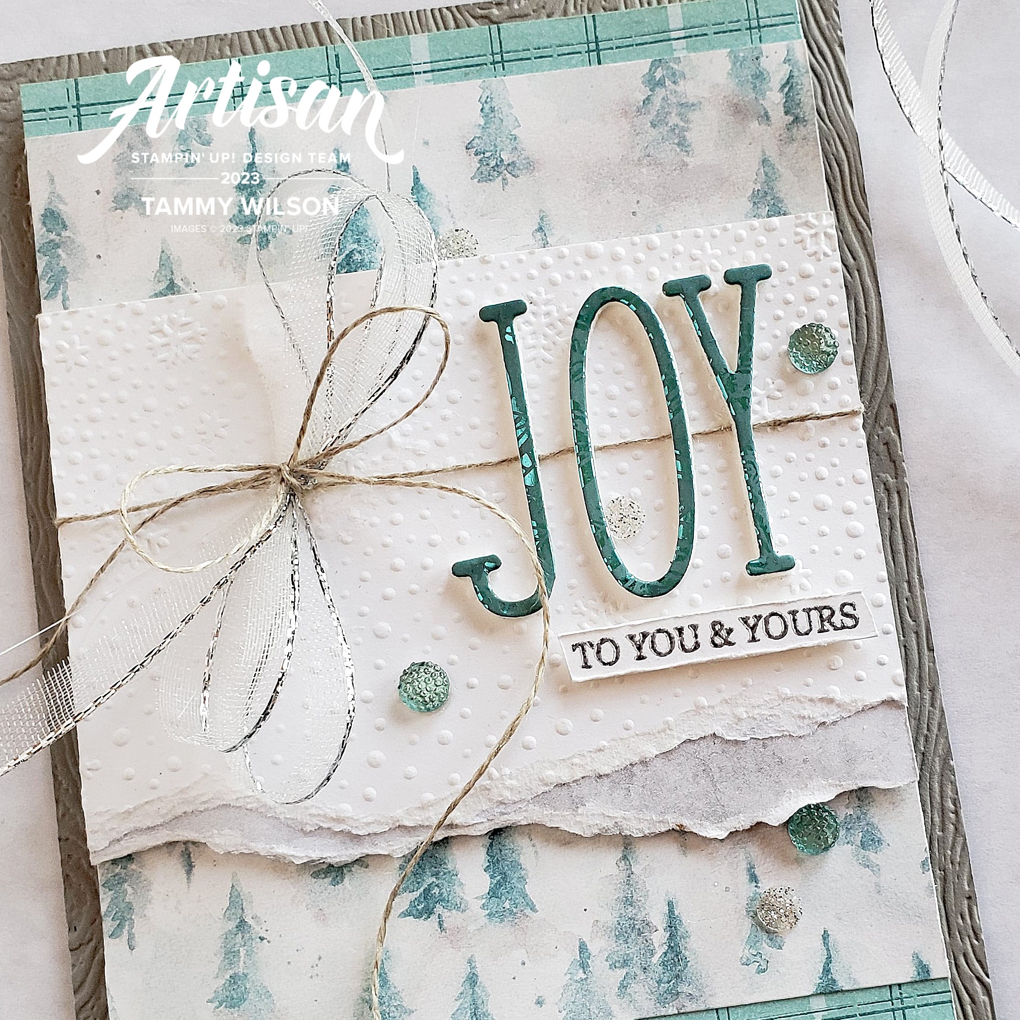The “joy” sentiment was die cut from the Snowflake Magic Specialty DSP, using the Alphabet A La Mode Dies. Before I die cut the letters, I also adhered the DSP to a Foam Adhesive Sheet. The smaller sentiment (from the Christmas Classics Stamp Set) was heat-embossed on Basic White Thick Cardstock, using my Versamark Pad and Silver Stampin’ Emboss Powder.