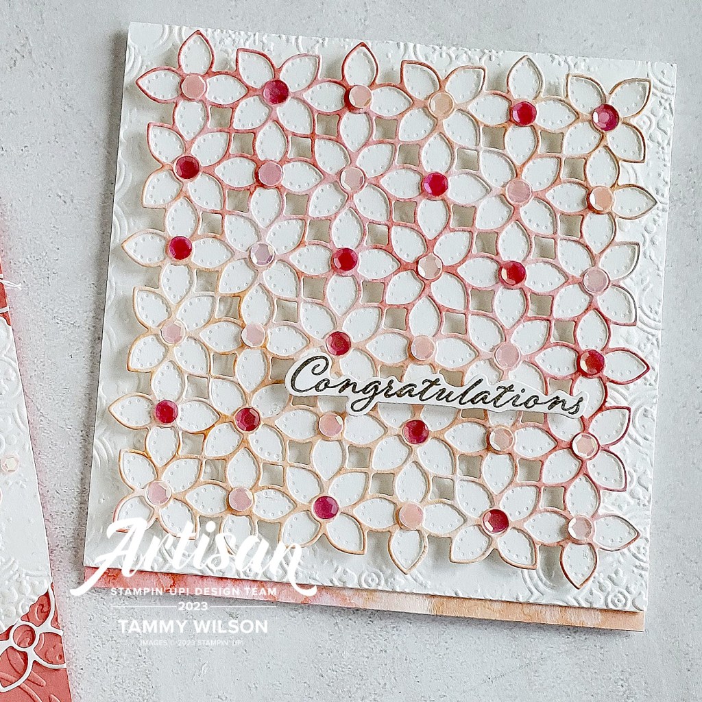 To create the next layer, I used a Blending Brush to add Flirty Flamingo and Petal Pink to Basic White Thick Cardstock, and then used a Water Painter to splatter water droplets. After I dried the paper with a Heat Tool, I used the other Petal Patterns Die to cut out the top layer. (I also tucked a strip of this watercolored paper to the underneath the bottom edge of the embossed cardstock.)