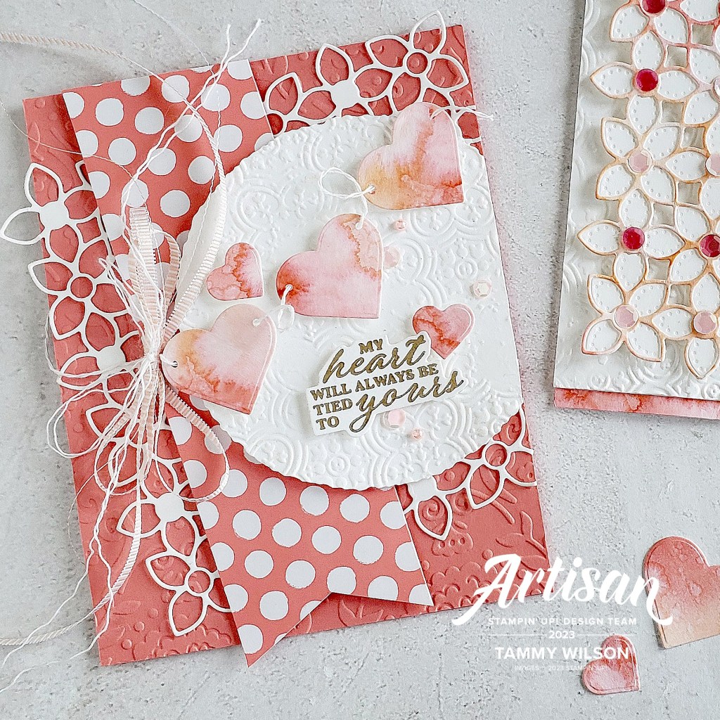 To create the hearts, I used a Blending Brush to add Flirty Flamingo and Petal Pink to Basic White Thick Cardstock, and then used a Water Painter to splatter water droplets. After I dried the paper with a Heat Tool, I used the Wonderful Thoughts Dies to cut out the hearts.