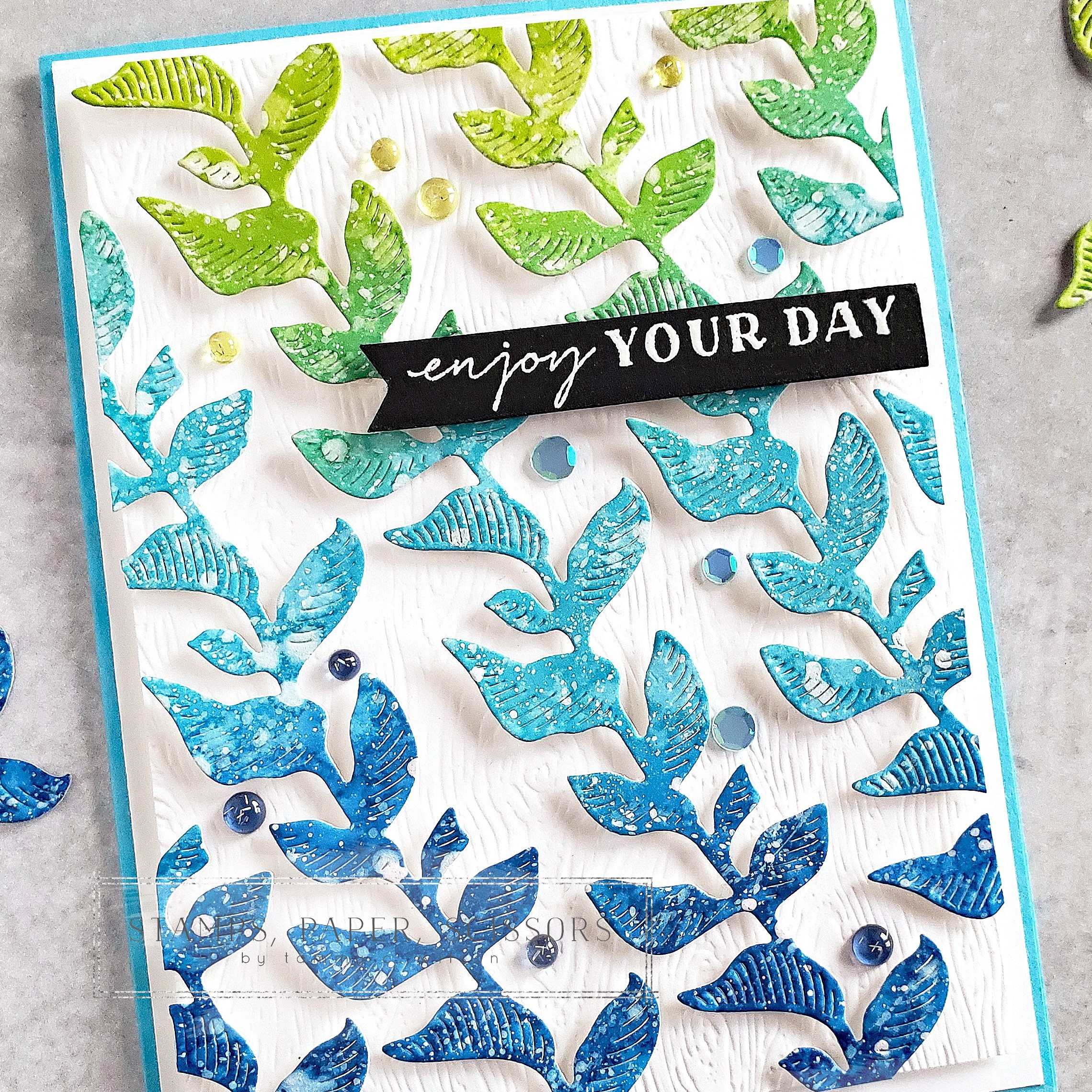To create the leaf stems, I used Blending Brushes to add Blueberry Bushel, Tahitian Tide, and Granny Apple Green to some Basic White Thick Cardstock. I then used a Water Painter to splatter water droplets on the cardstock, and dried the paper with a Heat Tool. Next, I used a Water Painter, along with White Craft Ink, to add more splattering. After I dried the paper with a Heat Tool again, I cut out several of the stems with one of the dies from the Notes of Nature Bundle. I trimmed off the stems as needed, and popped them up with Mini Stampin’ Dimensionals.
