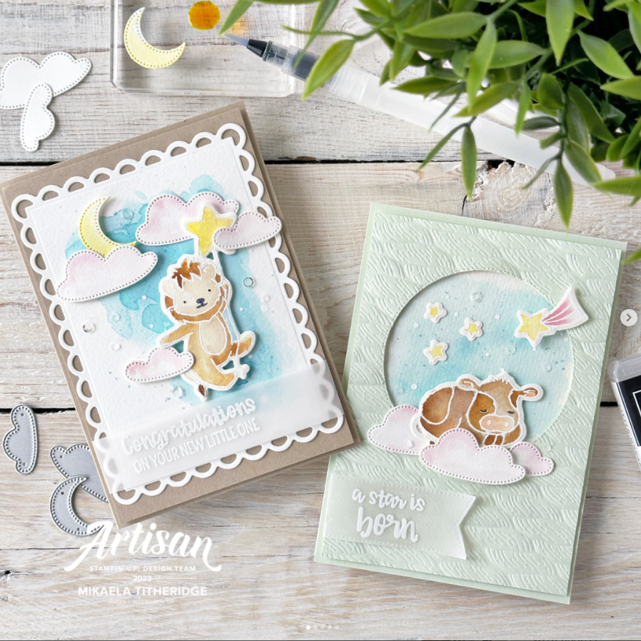 Above are the cards I chose to CASE, created by the super talented Mikaela Titheridge. My inspiration came from the soft pinks, yellows, and blues that she used on both of her cards. However, I did not have the Little Dreamers Bundle that she used. So…I used the die cut butterflies (created with one of the Meadow Dies) for the focus of my card.