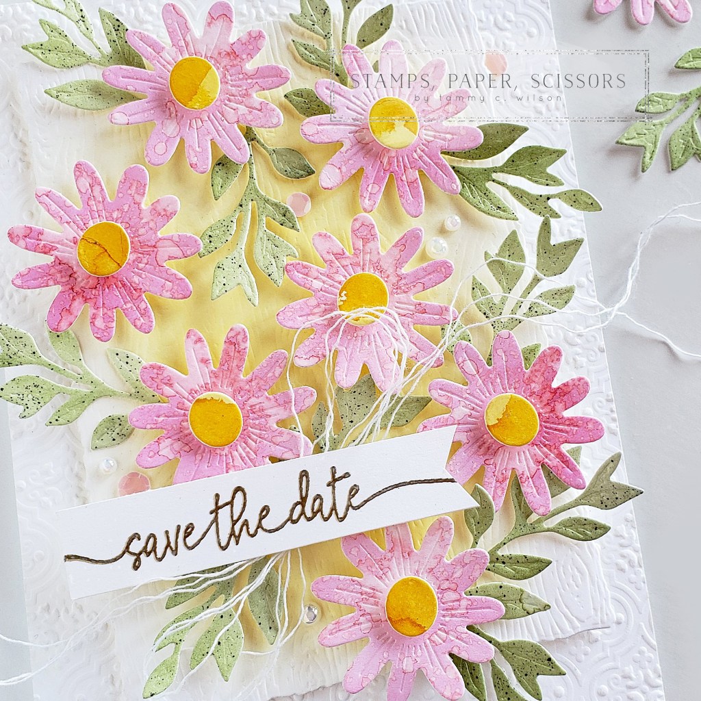 For the flowers, I used Blending Brushes to add Melon Mambo and Daffodil Delight (for the centers of the flowers) to Basic White Thick Cardstock. Next, I used a Water Painter to splatter water droplets on the cardstock, and then dried it with a Heat Tool. To cut out the flowers, I used the Around the Bend Dies.