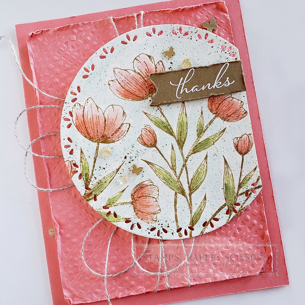 I stamped the flowers (from the Spotlight on Nature Bundle) on Fluid 100 Watercolor Paper, using a Saddle Brown Stazon Ink Pad. To watercolor the flowers, I used a Water Painter, along with Flirty Flamingo, Poppy Parade, Old Olive, Mossy Meadow, and a light wash of Pool Party for the background. I then used one of the Spotlight on Nature Dies to cut out the circle, and used an Early Espresso Stampin’ Write Marker to add some speckling. Before I used and used Stampin’ Dimensionals to adhere the circle to the card base, I tucked a Linen Thread bow underneath.